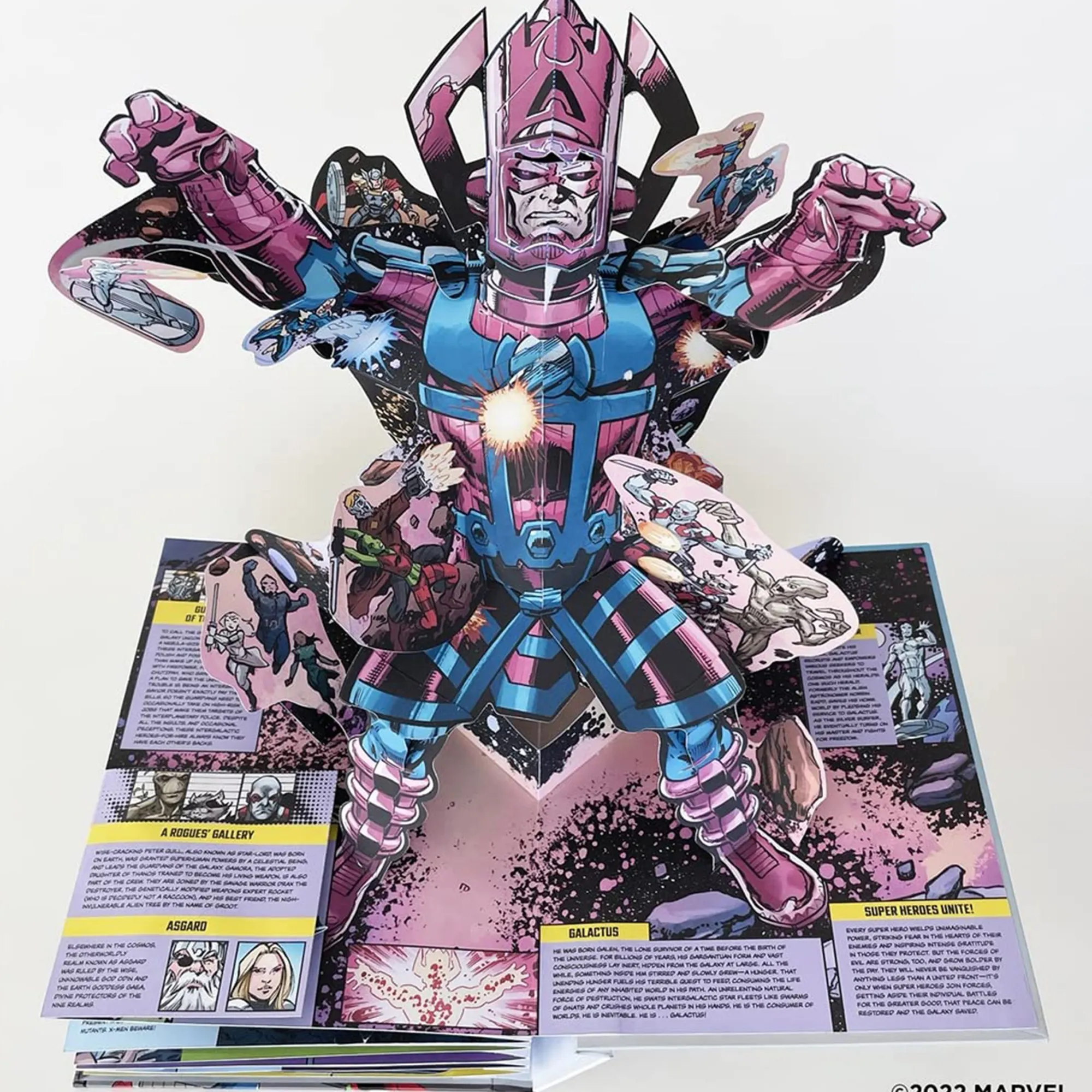 - Pop-Up Buch mit dreidimensional wirkenden Papierbildern verschiedener Charaktere aus dem Marvel-Universum