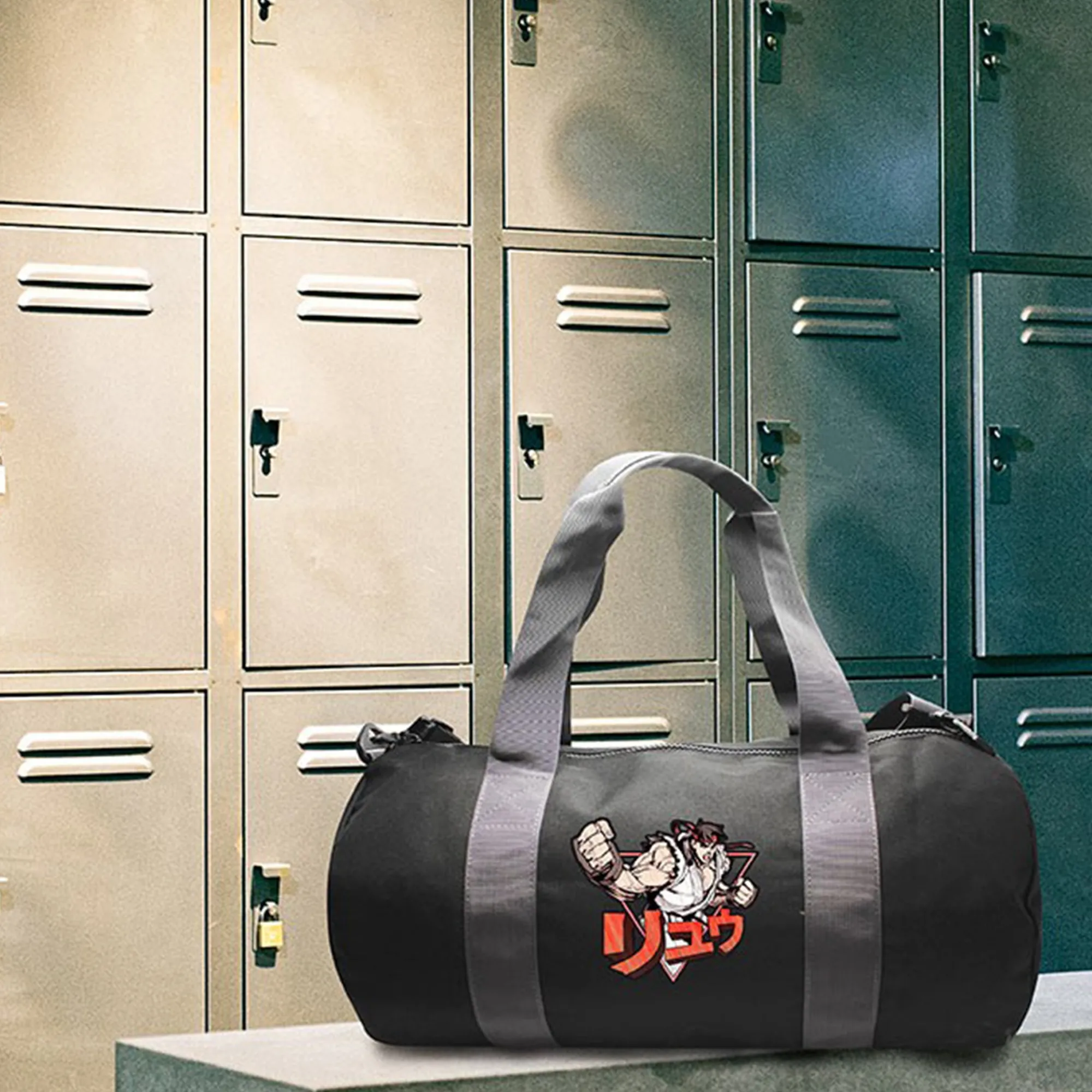 - Schwarze Sporttasche, auf der ein Bild des Charakters Ryu aus der Videospielserie Street Fighter abgebildet ist