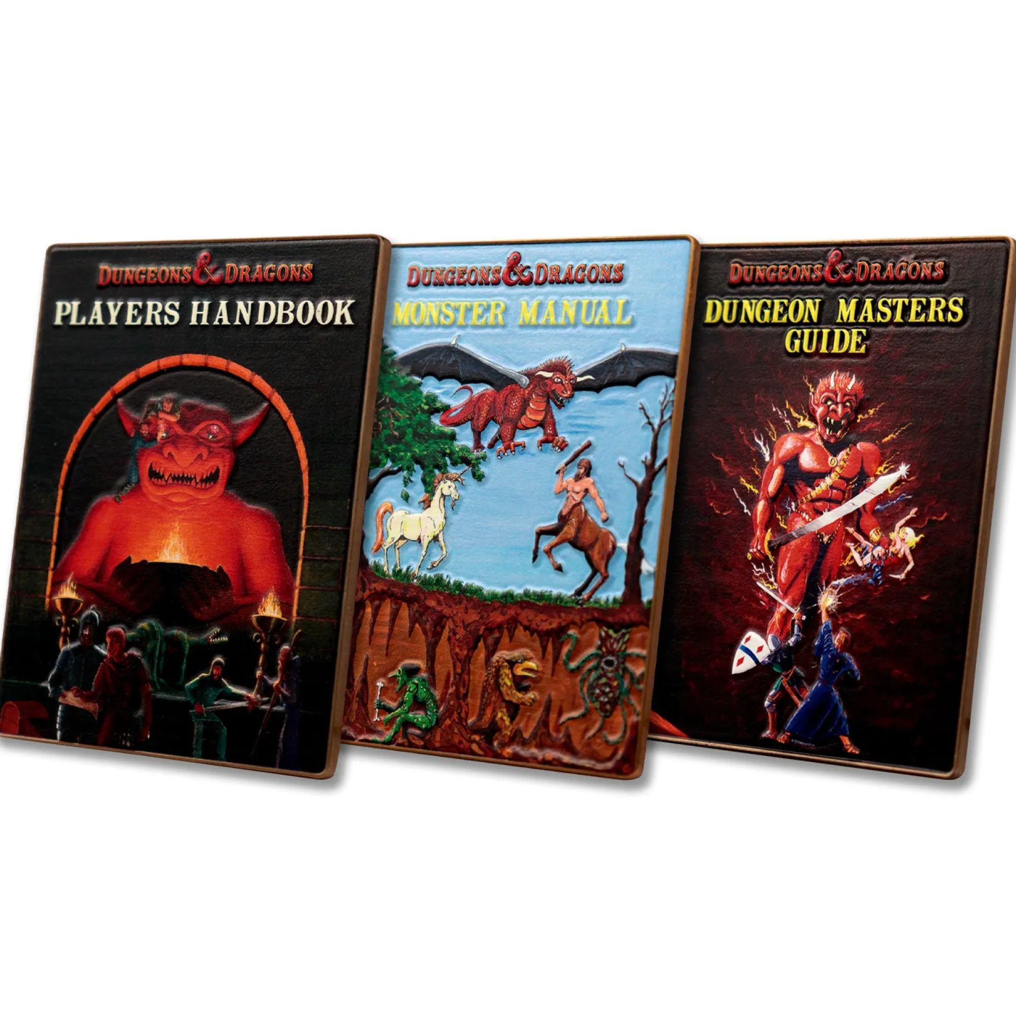 Die Barren zeigen die Cover der drei D&D Standardwerke aus der ersten Auflage von 1974: Das „Player’s Handbook“, das „Monster Manual“ und der „Dungeon Master’s Guide“ mit den ikonischen Designs von Dave Sutherland und Dave Trampiers.Jeder der Metallbarren ist hochwertig verarbeitet und mit farbiger Emaille veredelt. Das Set ist weltweit auf 1974 Stück limitiert und wird in einer individuell nummerierten Ausstellungsbox geliefert, in der die kleinen Schätze angemessen präsentiert werden können.