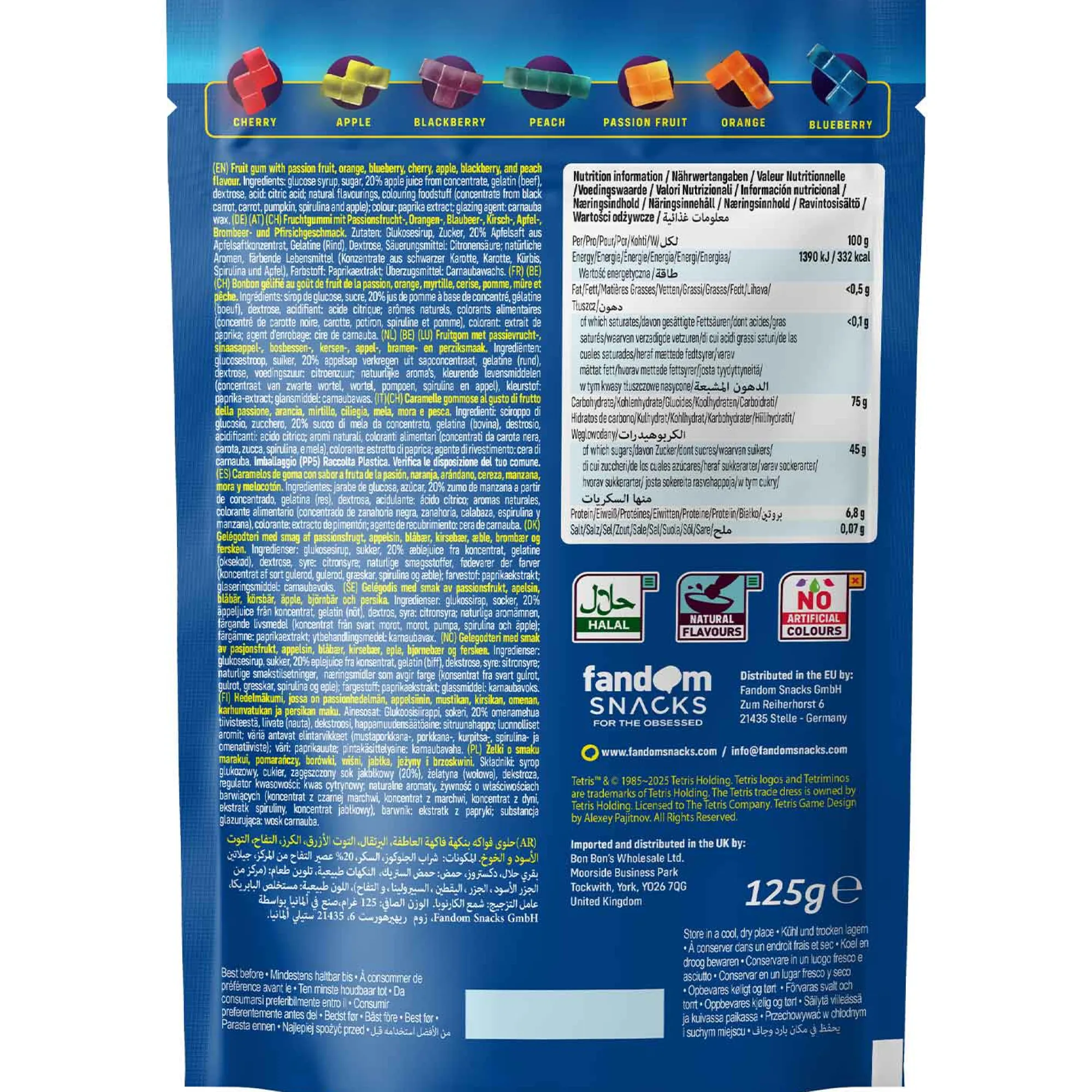 Zum Glück gibt es die Fandom Snacks Tetris Fruchtgummis als Alternative. Und sie sind (fast) genauso gesund wie echtes Obst, denn sie !!!enthalten die Vitamine C und E, 20 % Fruchtsaftgehalt!!! und sind dabei frei von Laktose, Gluten, Gentechnik und Konservierungsstoffen. Und damit jeder auf seine Kosten kommt, enthält eine Packung gleich acht Geschmacksrichtungen, nämlich Passionsfrucht, Orange, Kirsche, Brombeere, Pfirsich, Heidelbeere, Apfel und Himbeere.