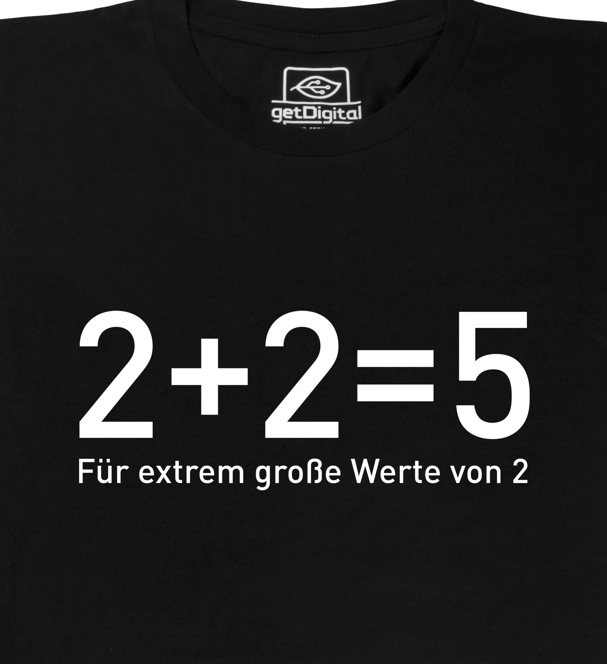 Egal, ob aus George Orwells Roman[i] 1984[/i], sowjetischer Propaganda oder Radioheads gleichnamigem Lied: Die (falsche) Gleichung 2 + 2 = 5 ist den meisten Menschen ein Begriff. Neben der Verwendung der Gleichung als Kritik an autoritären Systemen oder als Ansporn für die Arbeiter kann man das Thema aber auch aus einem mathematischen Blickwinkel betrachten, wie das „2 + 2 = 5“-T-Shirt zeigt.