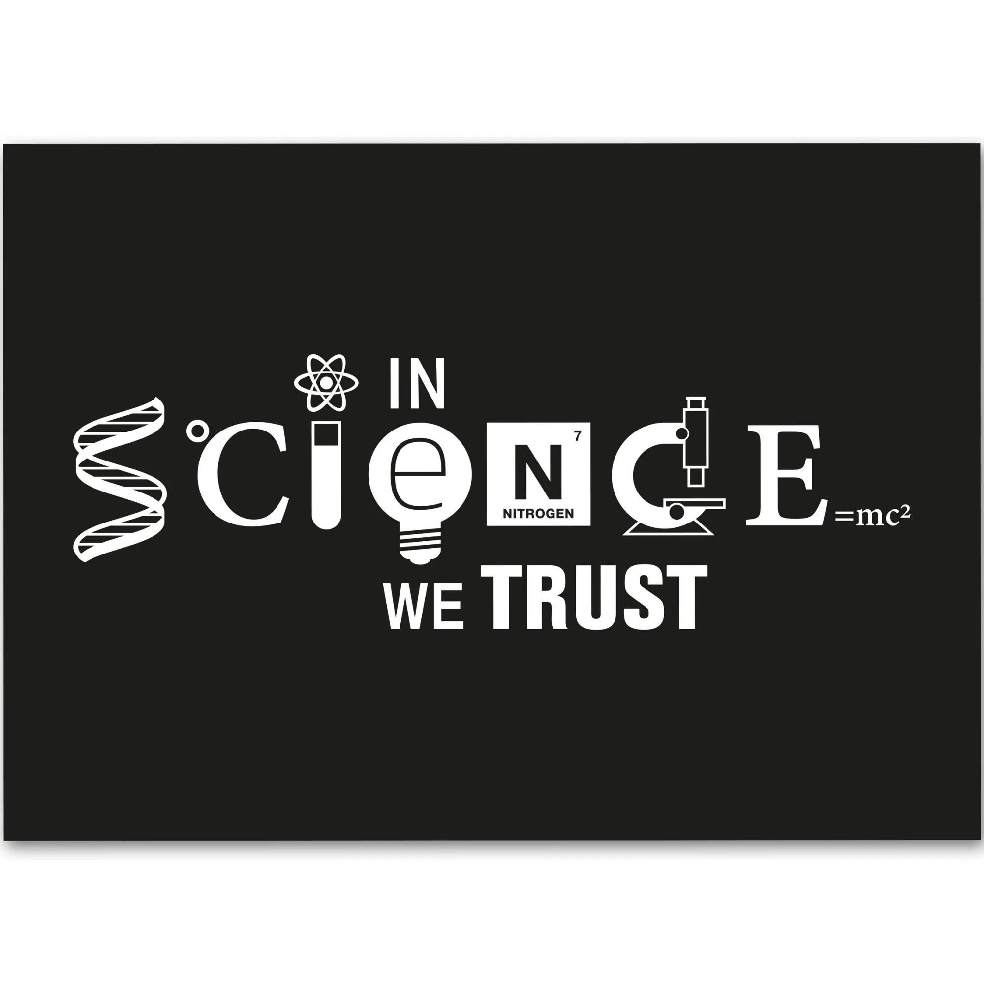 - Aufkleber mit dem Aufdruck „In Science We Trust“, gebildet aus diversen wissenschaftlichen Motiven