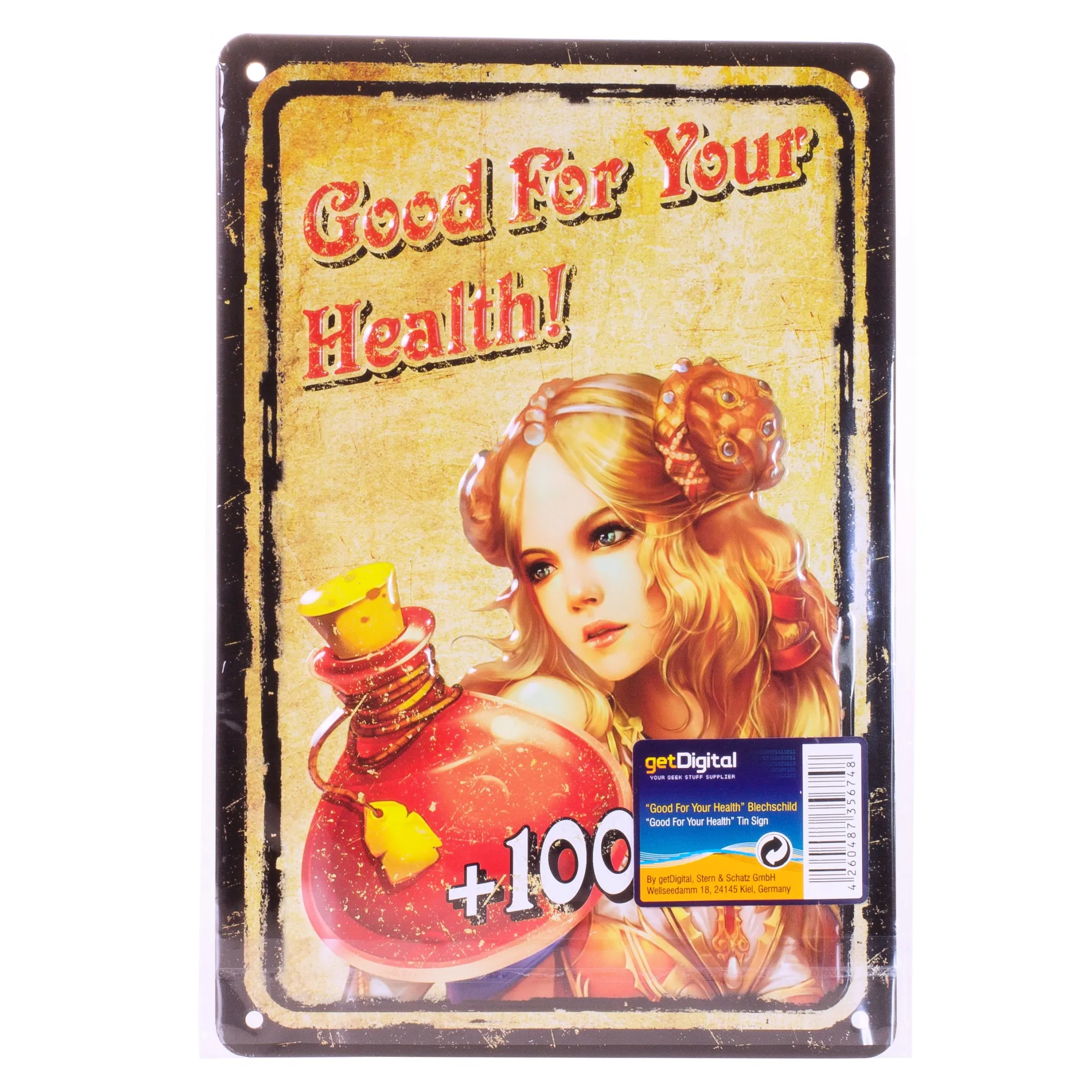 Wir müssen zugeben: Wenn es wirklich ein Produkt geben würde, wie das auf dem „Good for your health“-Blechschild, würden wir es sofort kaufen. Bis die Alchemie so weit ist, können wir mit diesem stabilen und geprägten Metallschild aber auch unsere Küche in eine Anlaufstelle für müde Abenteurer verwandeln. Dank der vier Löcher oder mit doppelseitigem Klebeband lässt es sich blitzschnell mit Nägeln oder Schrauben an Wänden, Türen und Turmschilden befestigen. Jetzt heißt es nur noch, ein rotes Getränk zu beschaffen, es in kleine Fläschchen umzufüllen und zu verkaufen. 😉