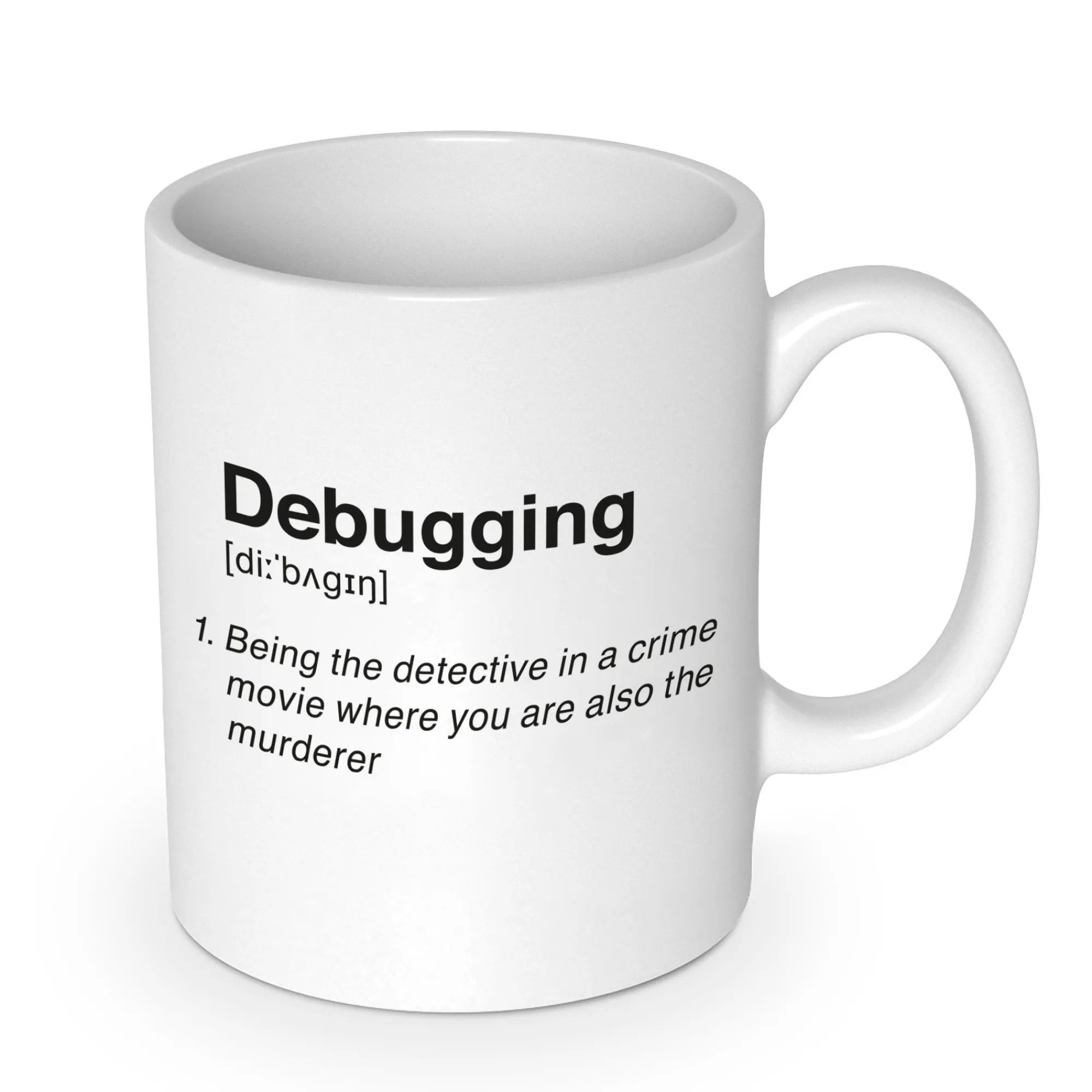 - Keramikbecher mit einer äußerst treffenden Definition von Debugging