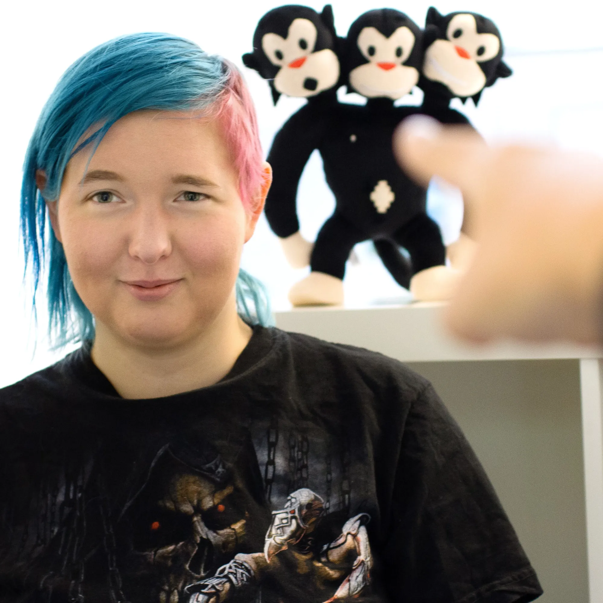 Unser plüschiger Affe hat alles, was auch das Original aus Monkey Island ausmacht: verschiedene affenmäßige Gesichtsausdrücke (von chaotisch gut gelaunt bis anarchisch aufgeregt und zu jeder Schandtat bereit); lange Arme und einen Schwanz um in Palmen herumzuschaukeln; und vielleicht am besten: einen pixeligen Bauchnabel. 😀