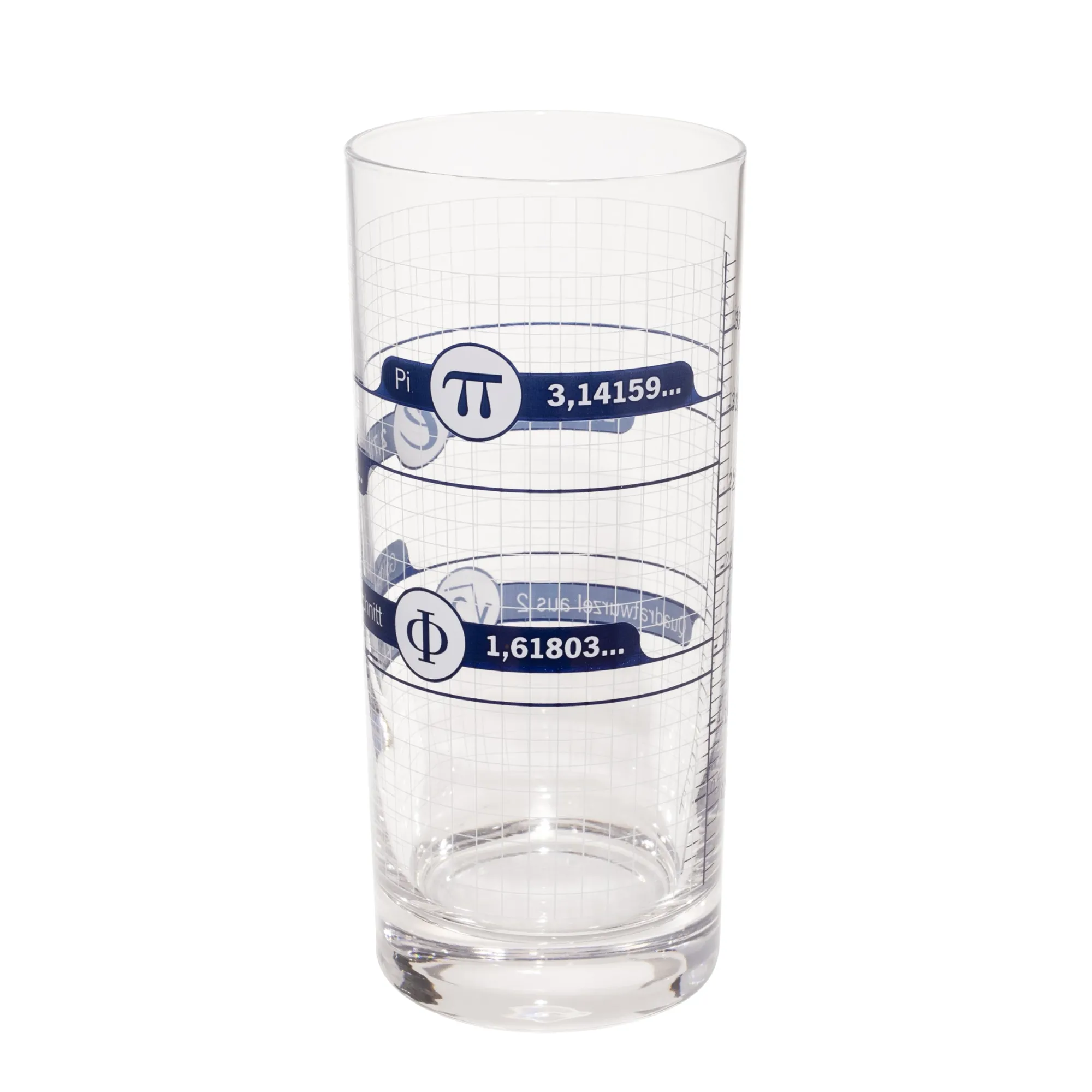 Denn das Irrationale Zahlen Trinkglas ist mit einer Skala in Deziliter versehen, und würdigt gleichzeitig vier irrationale Zahlen aus der Mathematik. Zum Beispiel kannst du demnächst bei ca. 1,41421 (Eulersche Zahl) dl Whiskey oder ca. 3,14159 (Pi) dl Limonade die Errungenschaften der Mathematik feiern. Die Angaben auf dem Glas umfassen für jede irrationale Zahl das Symbol, den Namen, und die Dezimalschreibweise bis auf 5 Nachkommastellen.