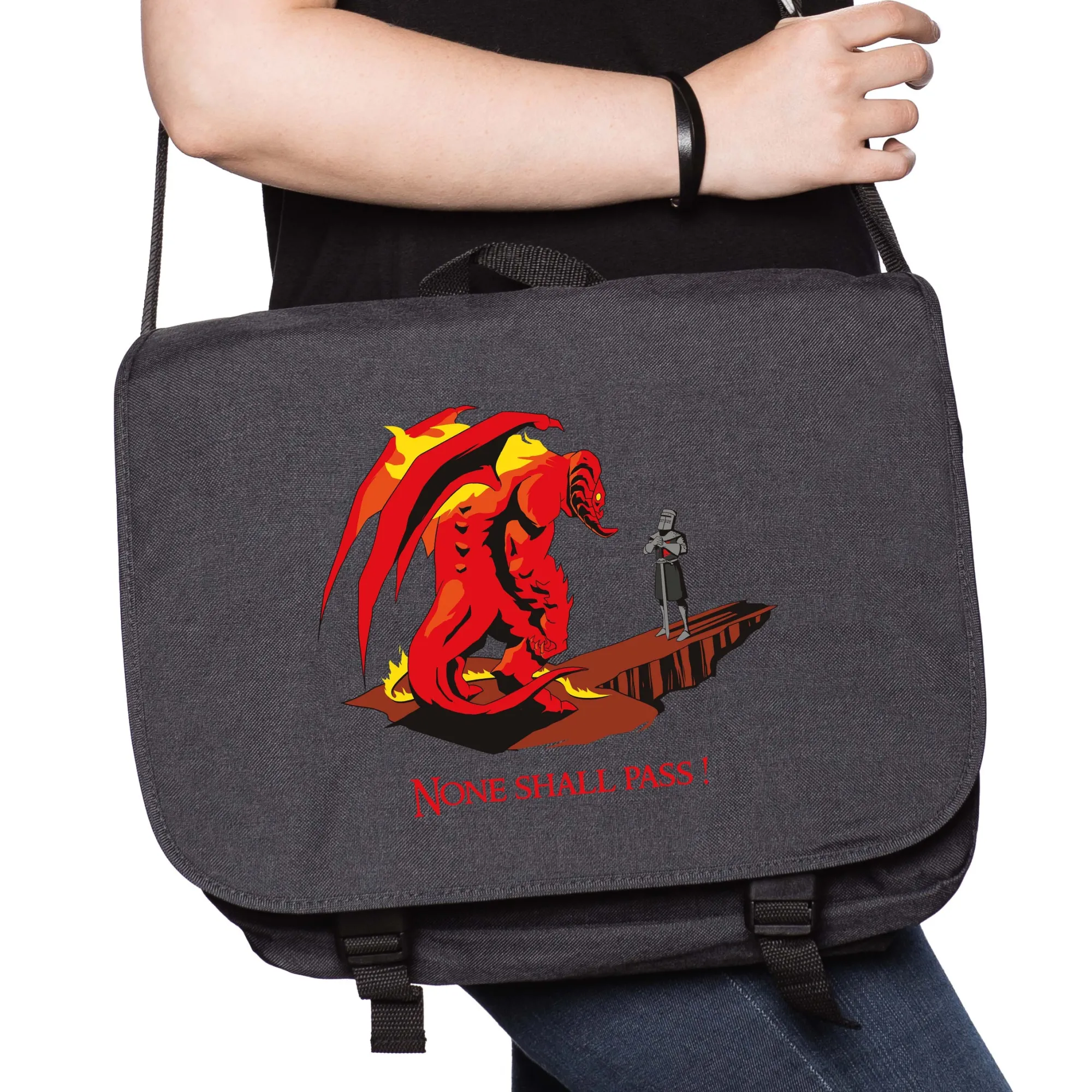Eine epische Szene ist auf dieses „None Shall Pass“ T-Shirt gedruckt. Wir alle kennen sie. Die neun Gefährten wagen den gefährlichen Weg durch die Zwergenmine und werden dabei vom Balrog bis zur Brücke von Khazad-dûm verfolgt. Alle bis auf einen überqueren die Brücke. Dieser eine bleibt zurück, um sie vor dem schrecklichen Monster zu schützen. Es ist natürlich niemand anderes als… der schwarze Ritter!?