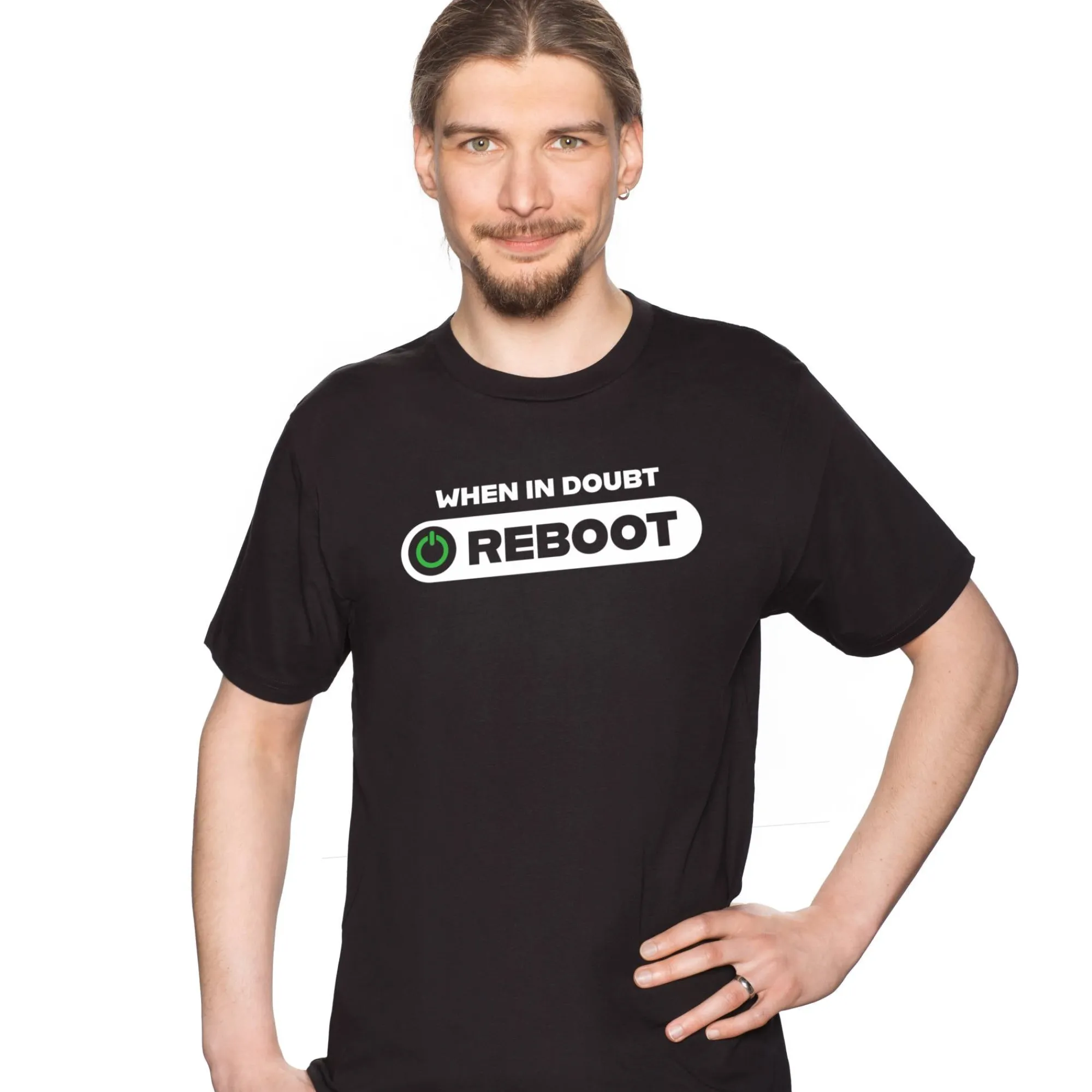 Ob es die Software, Hardware oder die analoge Welt außerhalb des Rechners ist – manchmal, wenn sich die Dinge zu sehr verworren und heiß gelaufen haben, braucht es nur einen Neustart. Und das passende Shirt, das einen daran erinnert.