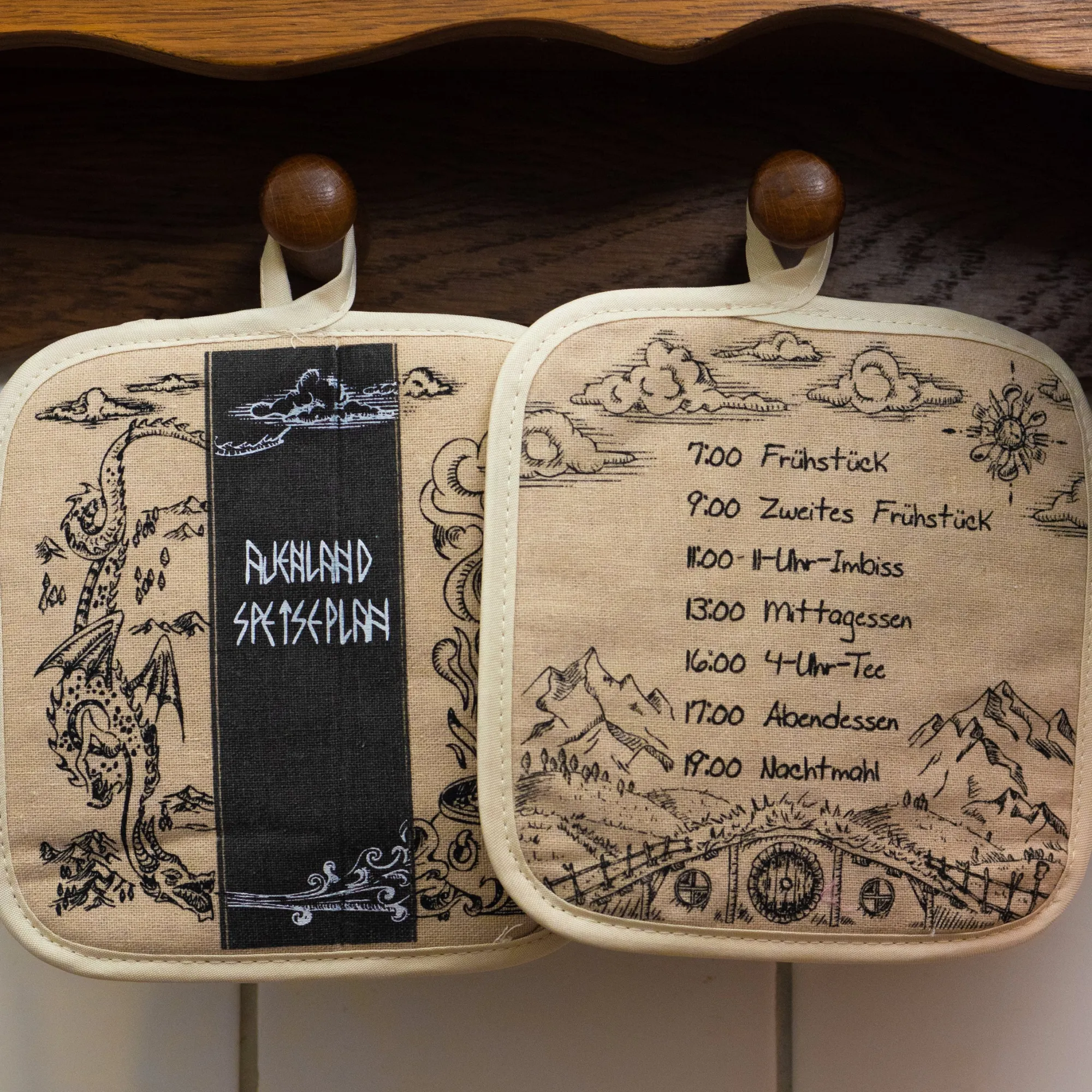 - Set aus 2 Topflappen mit dem Speiseplan der Halblinge aus dem Auenland