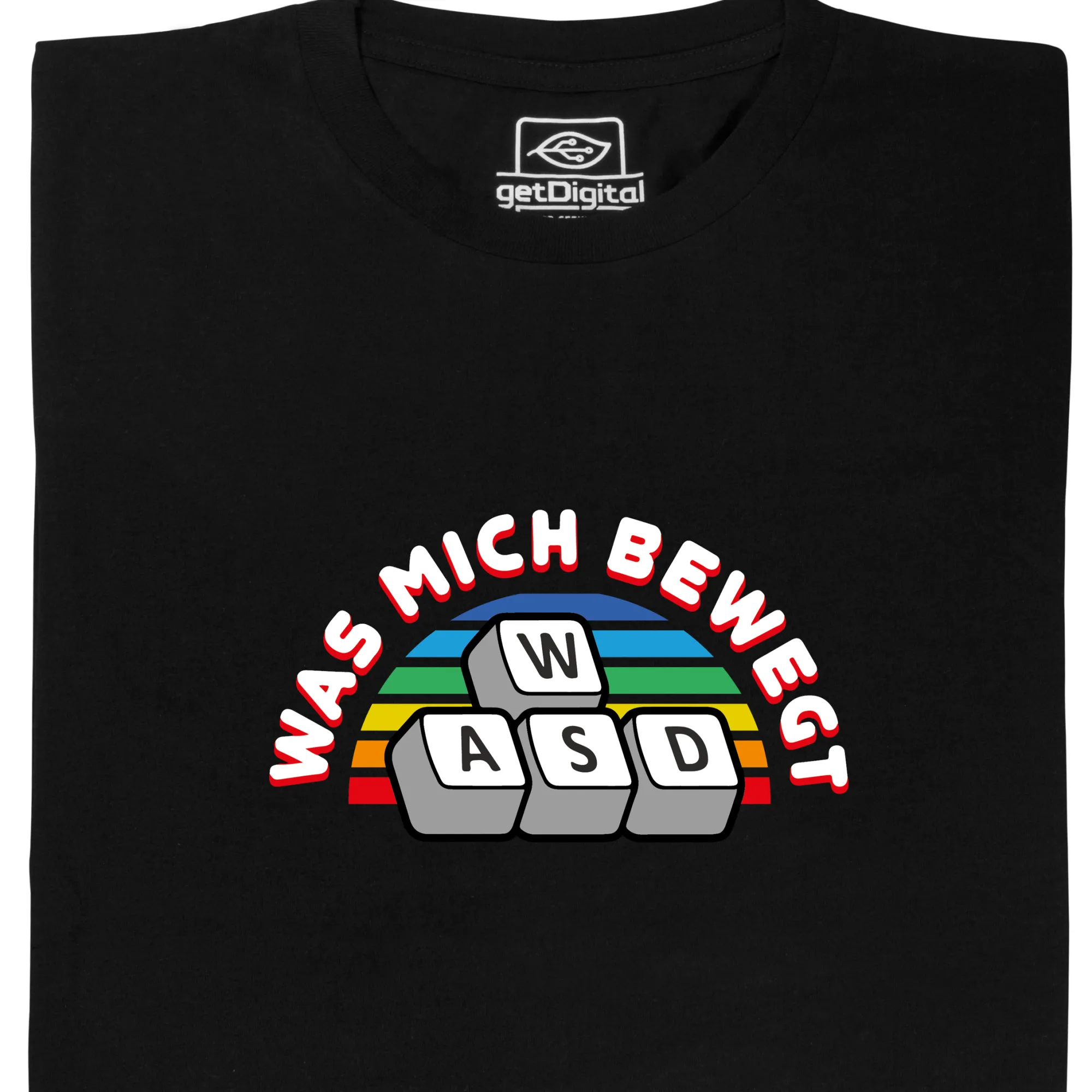 Dieses T-Shirt ist ein Muss für alle Gaming-Enthusiasten!Der Aufdruck zeigt die bekannten W, A, S und D Tasten einer Tastatur, umgeben von einem regenbogenfarbenen Kreis, der an Retro-Arcade-Spiele erinnert. Über den Tasten prangt der Schriftzug „WAS MICH BEWEGT“, ein cleveres Wortspiel, das sowohl die emotionale Bewegung als auch die physische Steuerung durch die WASD-Tasten in der Welt der Computerspiele darstellt. Ideal für lange Gaming-Sessions oder als lässiges Alltagsoutfit. Ein absolutes Highlight in der Garderobe eines jeden Gamers!