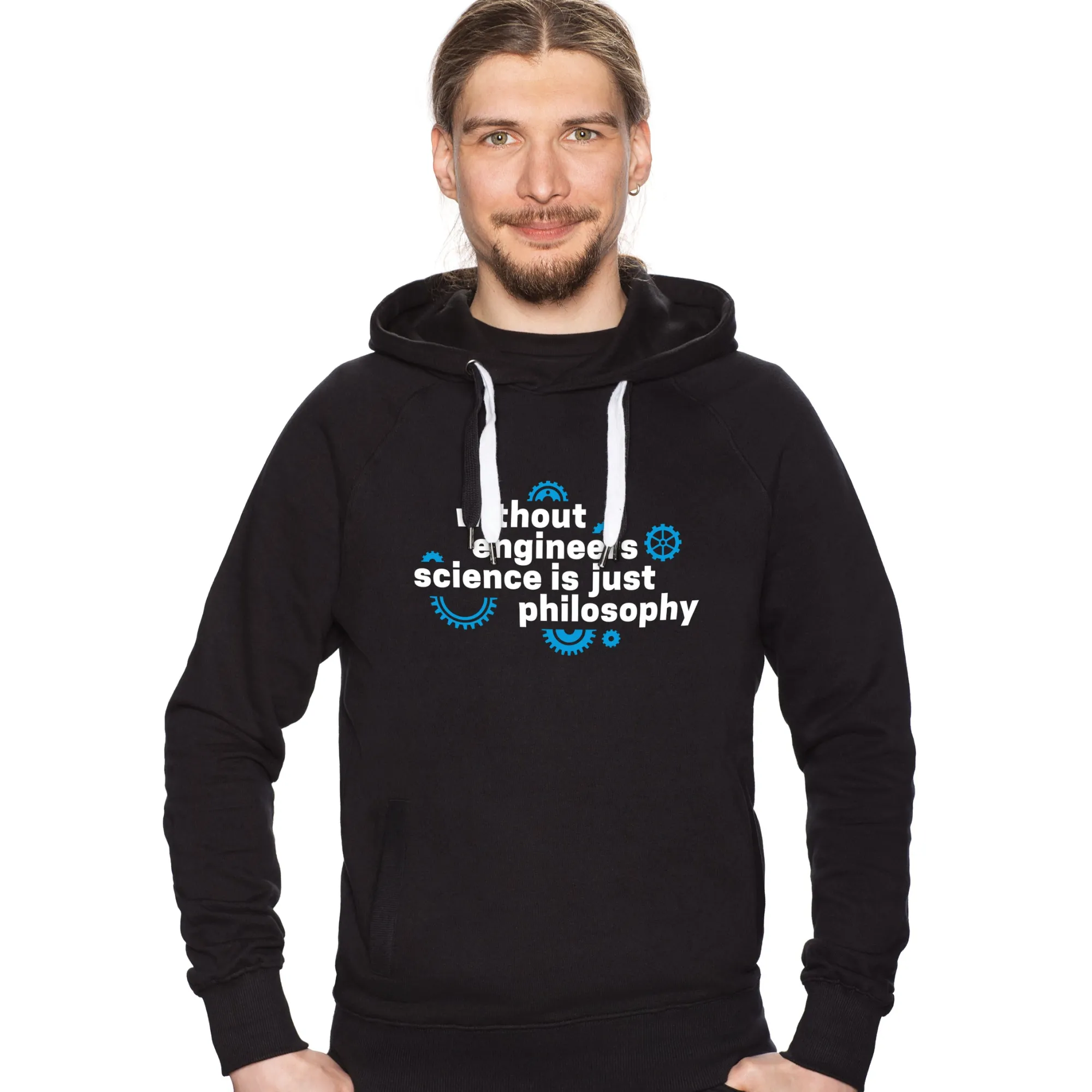 Das „Without Engineers“-T-Shirt geht sogar noch einen Schritt weiter und verkündet provokant: „[i]Without engineers, science is just philosophy[/i]“ (Engl. für: Ohne Ingenieure ist Wissenschaft auch nur Philosophie). Natürlich muss diese Aussage mit einem Korn Salz verstanden werden: Insbesondere in den Naturwissenschaften sind viele wissenschaftliche Errungenschaften erst durch das Mitwirken von Ingenieuren möglich geworden. Es ist also verständlich, dass diese Zunft deshalb in einem besonderen Licht gesehen wird. Dass dies nicht gilt, sobald wir den Positivismus hinter uns lassen, sollte jedermann klar sein. 😉