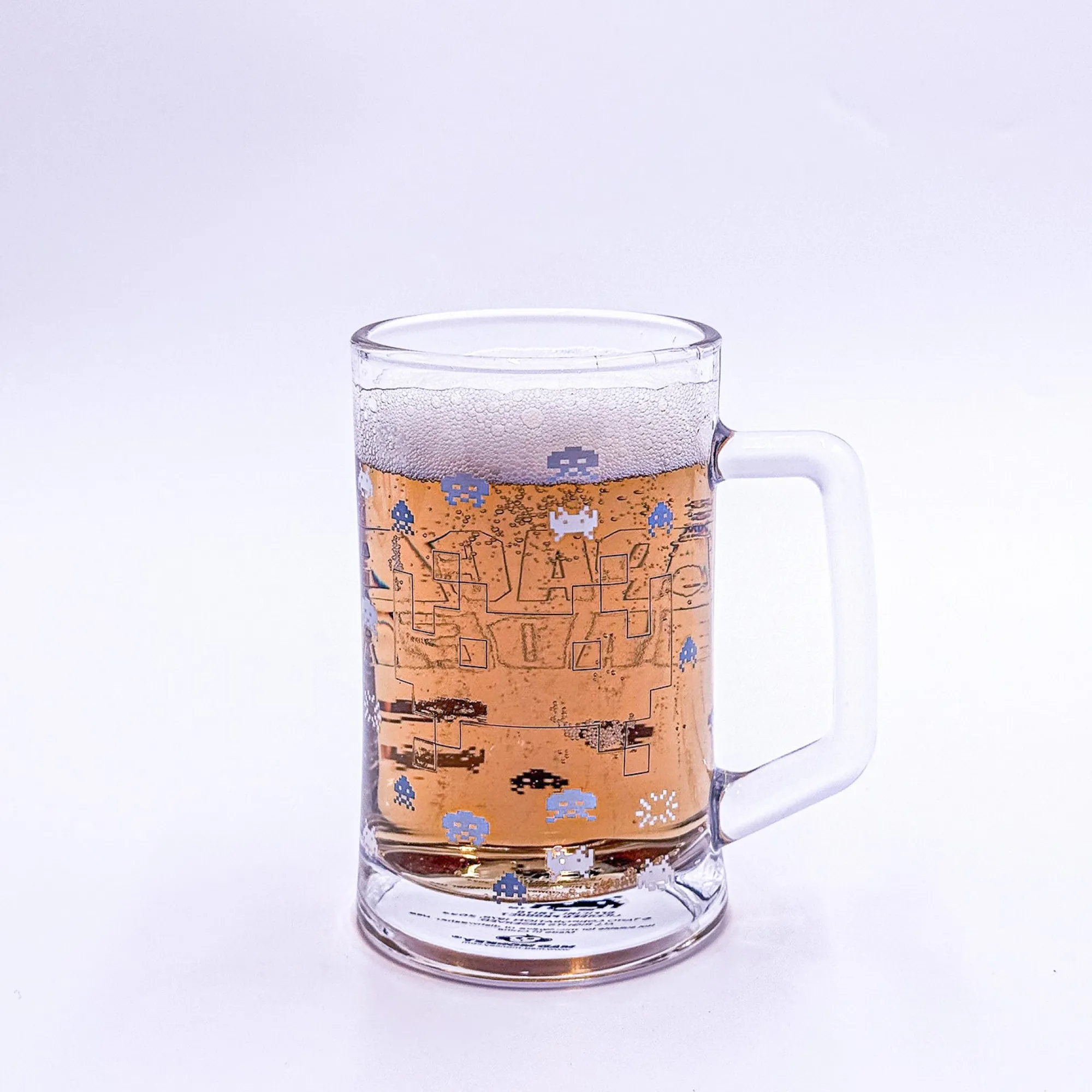 Das Bierglas besteht aus robustem Klarglas und bietet mit einem Fassungsvermögen von 350 ml genug Platz für dein Feierabendbier, eine Limo oder was auch immer dich beim nächsten Gaming-Abend begleiten soll. Die rundum gedruckten Space Invaders Motive – inklusive der klassischen Gegnerformation und dem bekannten Schriftzug – sorgen dafür, dass der nostalgische Vibe bei jedem Schluck mitkommt. Dank des stabilen Henkels liegt das Glas gut in der Hand.