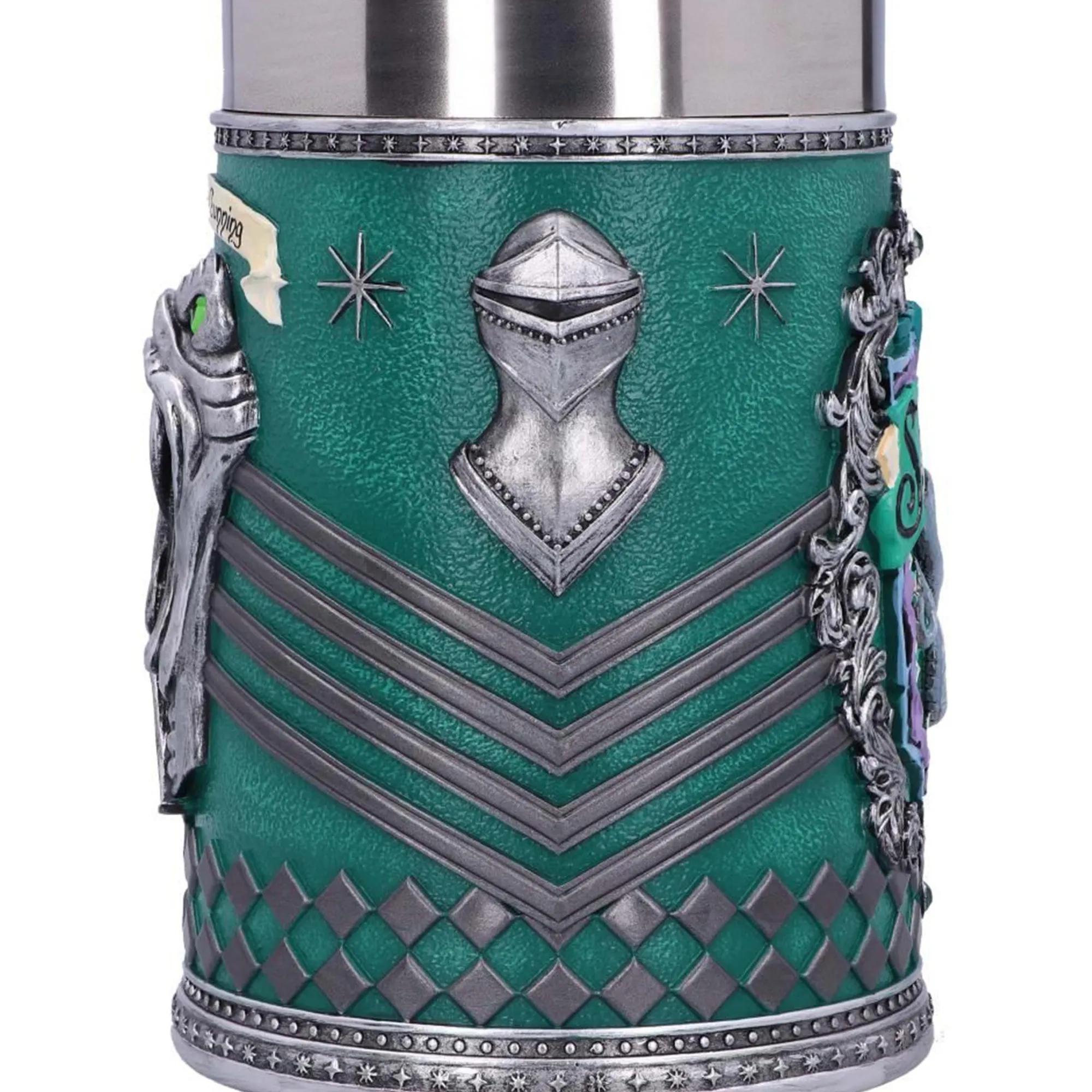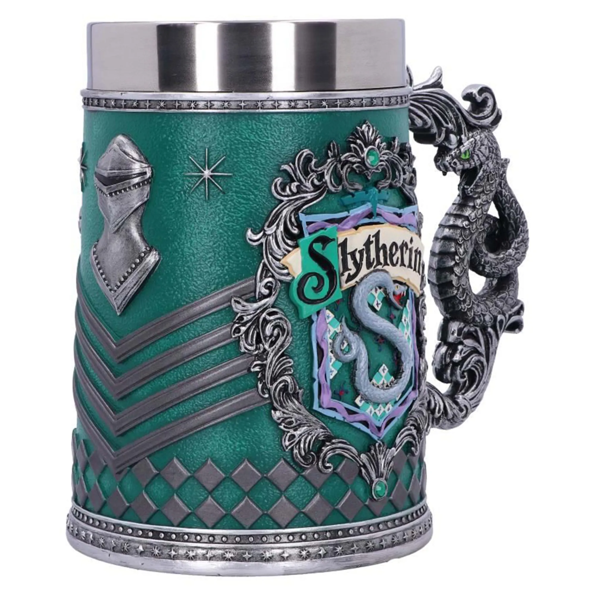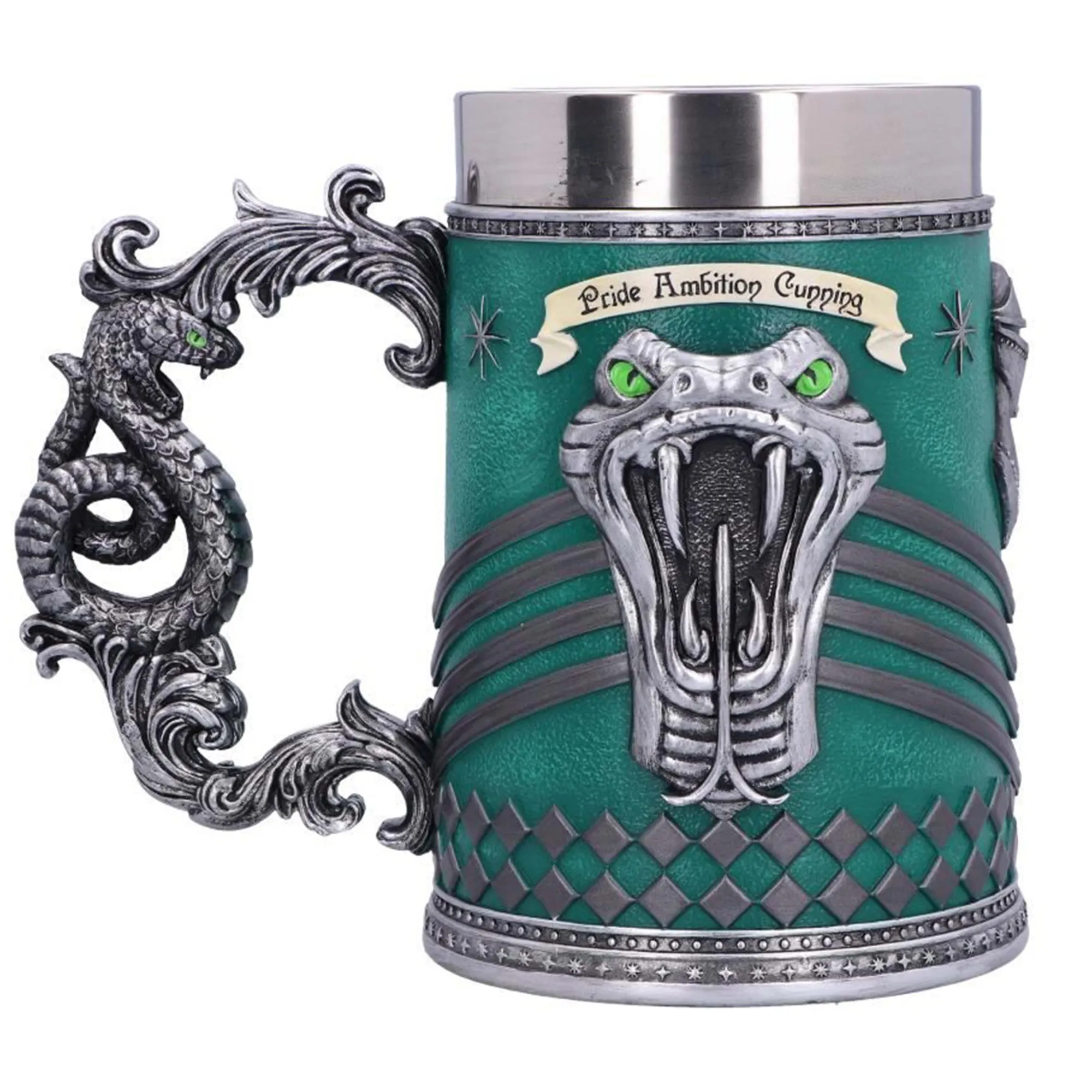 - Der grüne Slytherin Weinkelch zeigt das Hauswappen und die detaillierte Abbildung einer Schlange. Auch der Stiel des Gefäßes ist einer Schlange nachempfunden, und der Kelch ist mit kleinen Details wie Sternen, einem grünen Stein, und weiteren Details reich verziert.