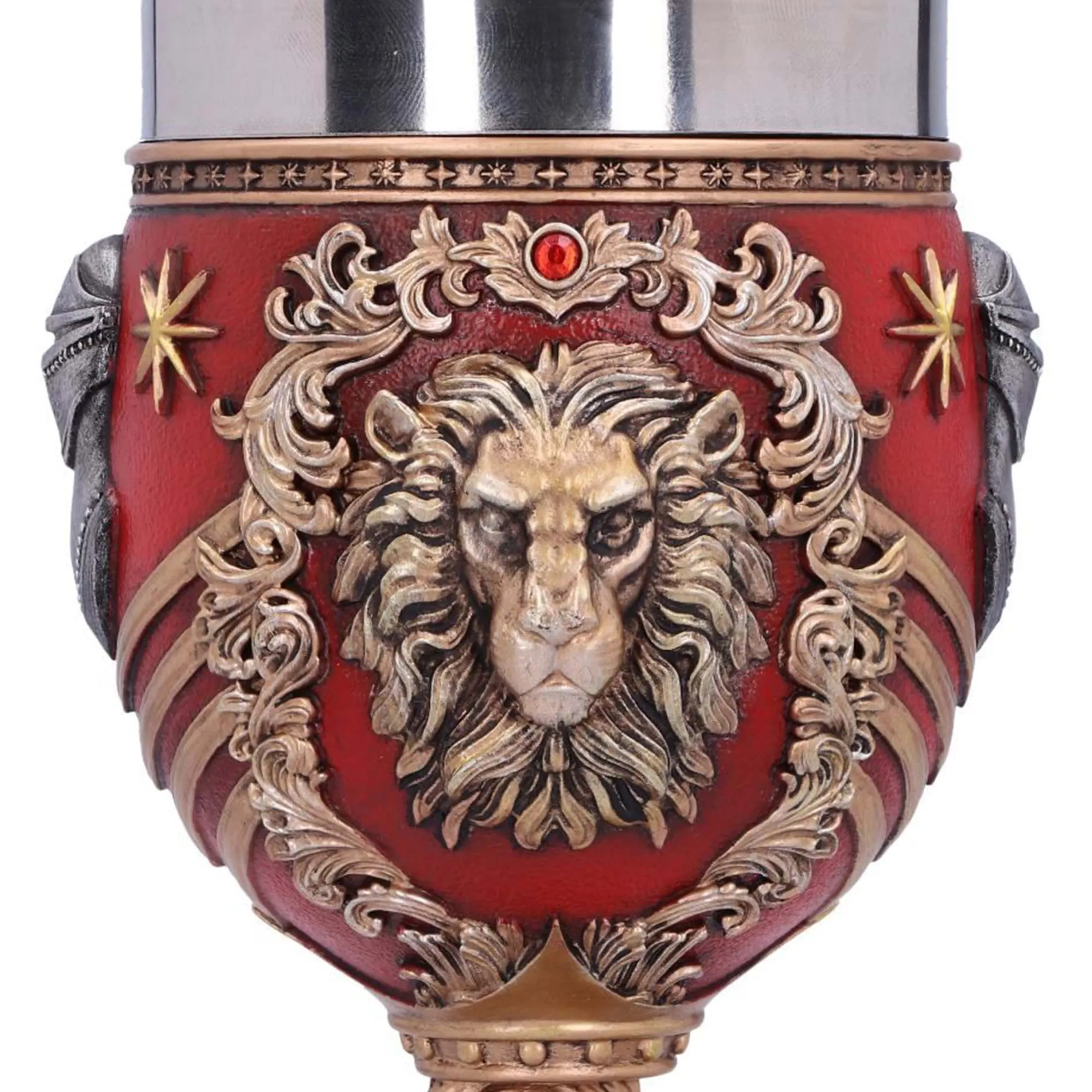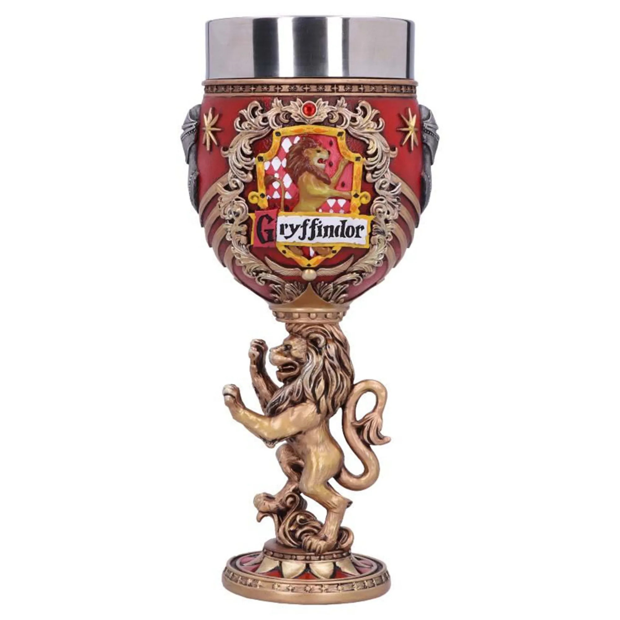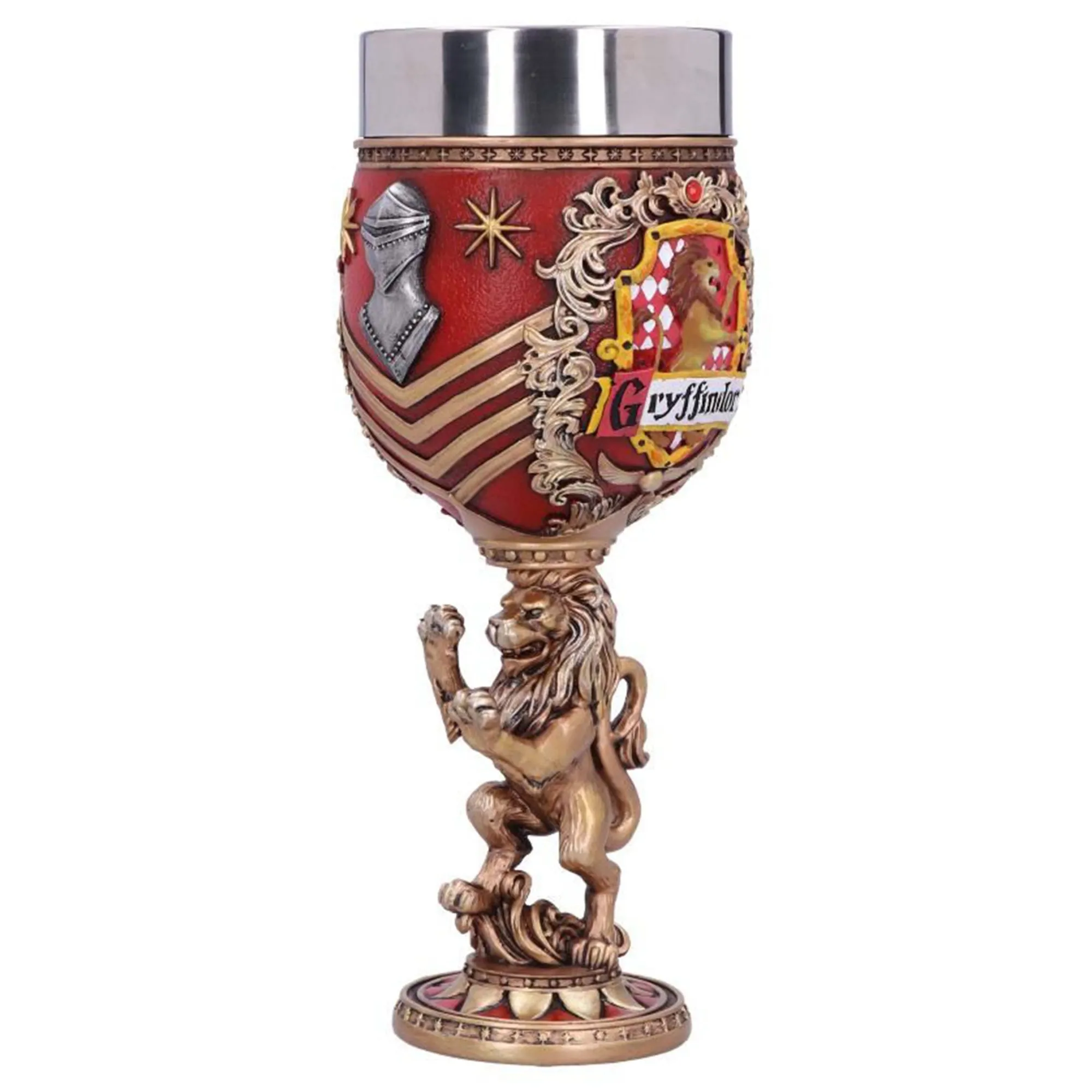 - Der grüne Slytherin Weinkelch zeigt das Hauswappen und die detaillierte Abbildung einer Schlange. Auch der Stiel des Gefäßes ist einer Schlange nachempfunden, und der Kelch ist mit kleinen Details wie Sternen, einem grünen Stein, und weiteren Details reich verziert.