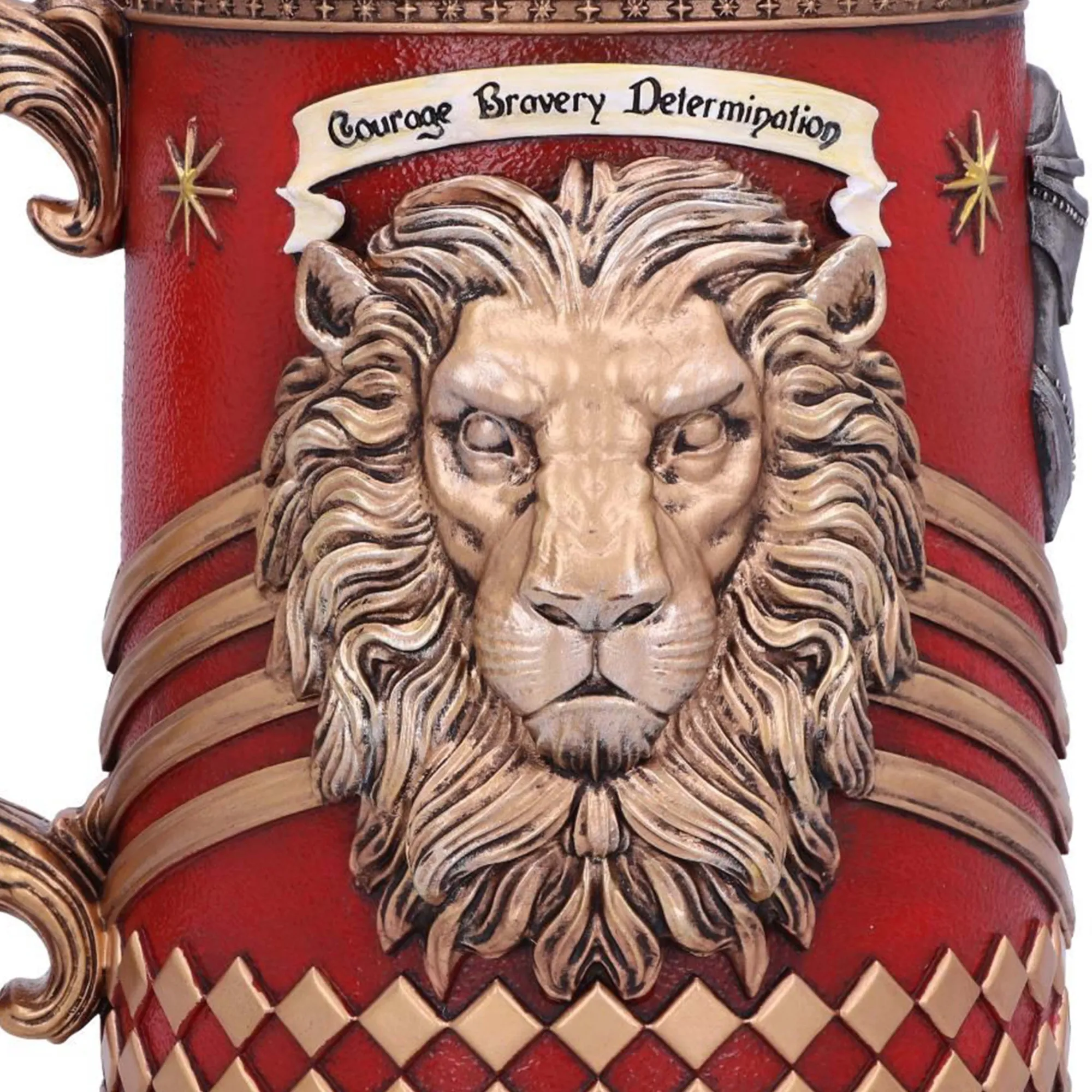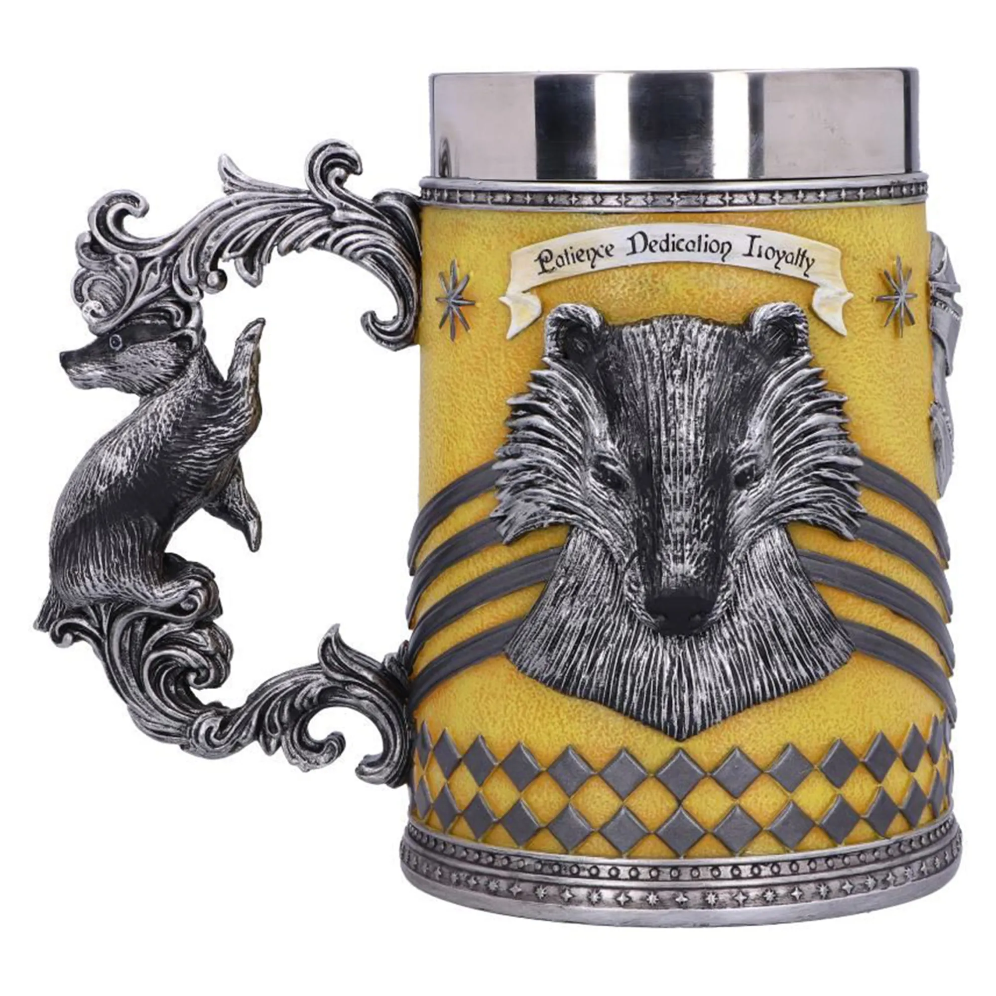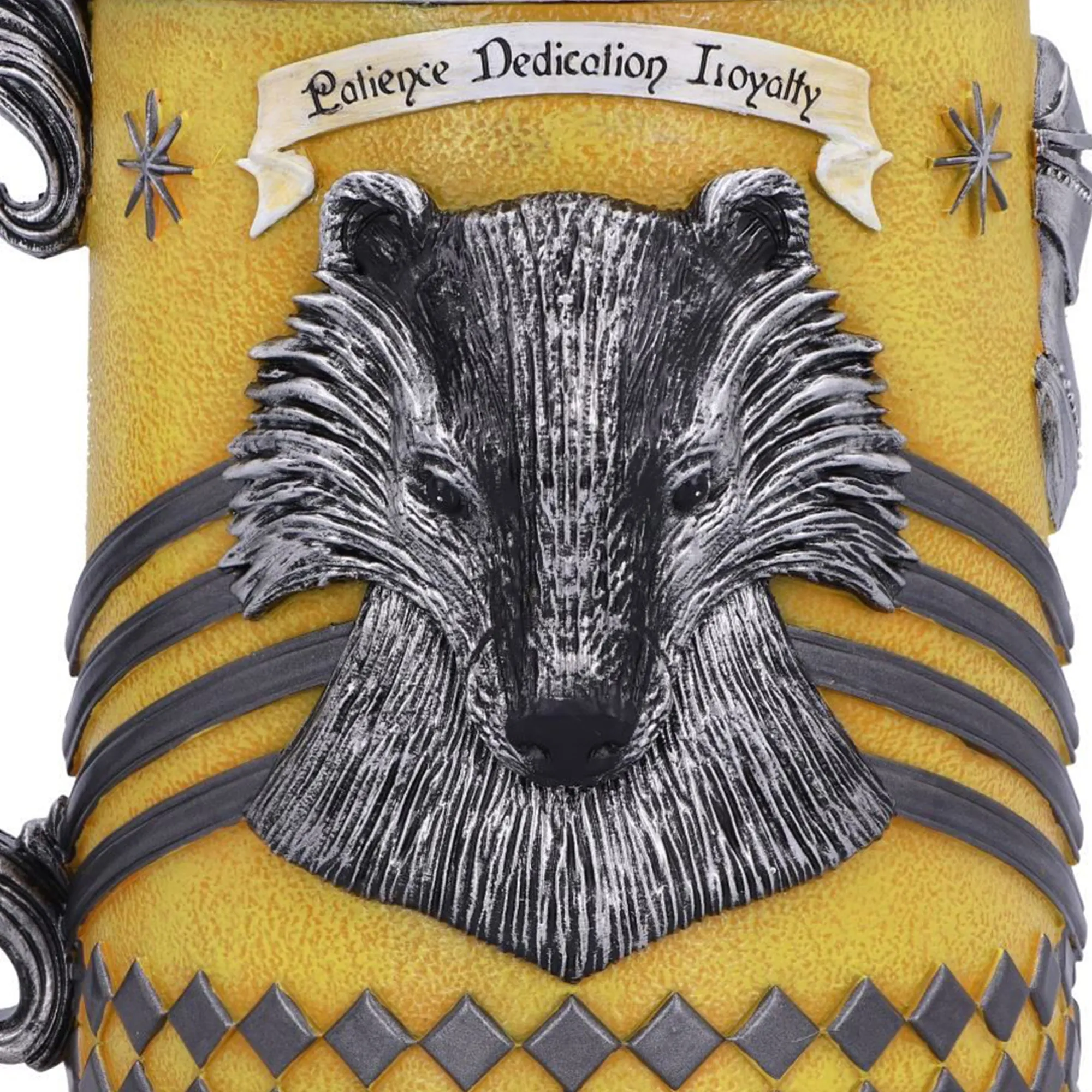 - Der Hufflepuff Bierkrug trägt die Farbe Gelb. Der Henkel des Trinkgefäßes ist dem Wappentier der Hufflepuffs, dem Dachs, nachempfunden. Das Hauswappen selbst und ein weiterer Dachs sind auf dem Gefäß zu sehen, das mit Sternen, einem gelben Stein und weiteren Details reich verziert ist. Auf dem Bierkrug stehen außerdem die 3 Haupteigenschaften bzw. -werte der Hufflepuffs.