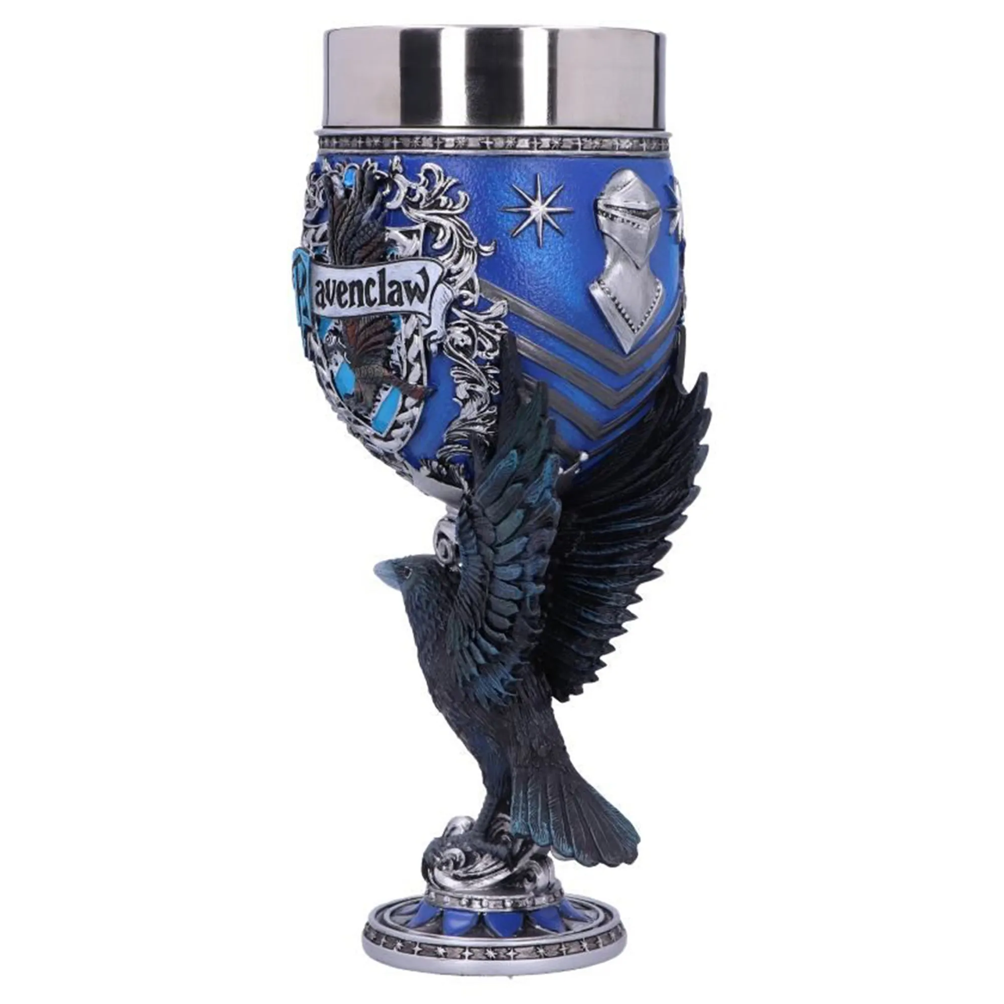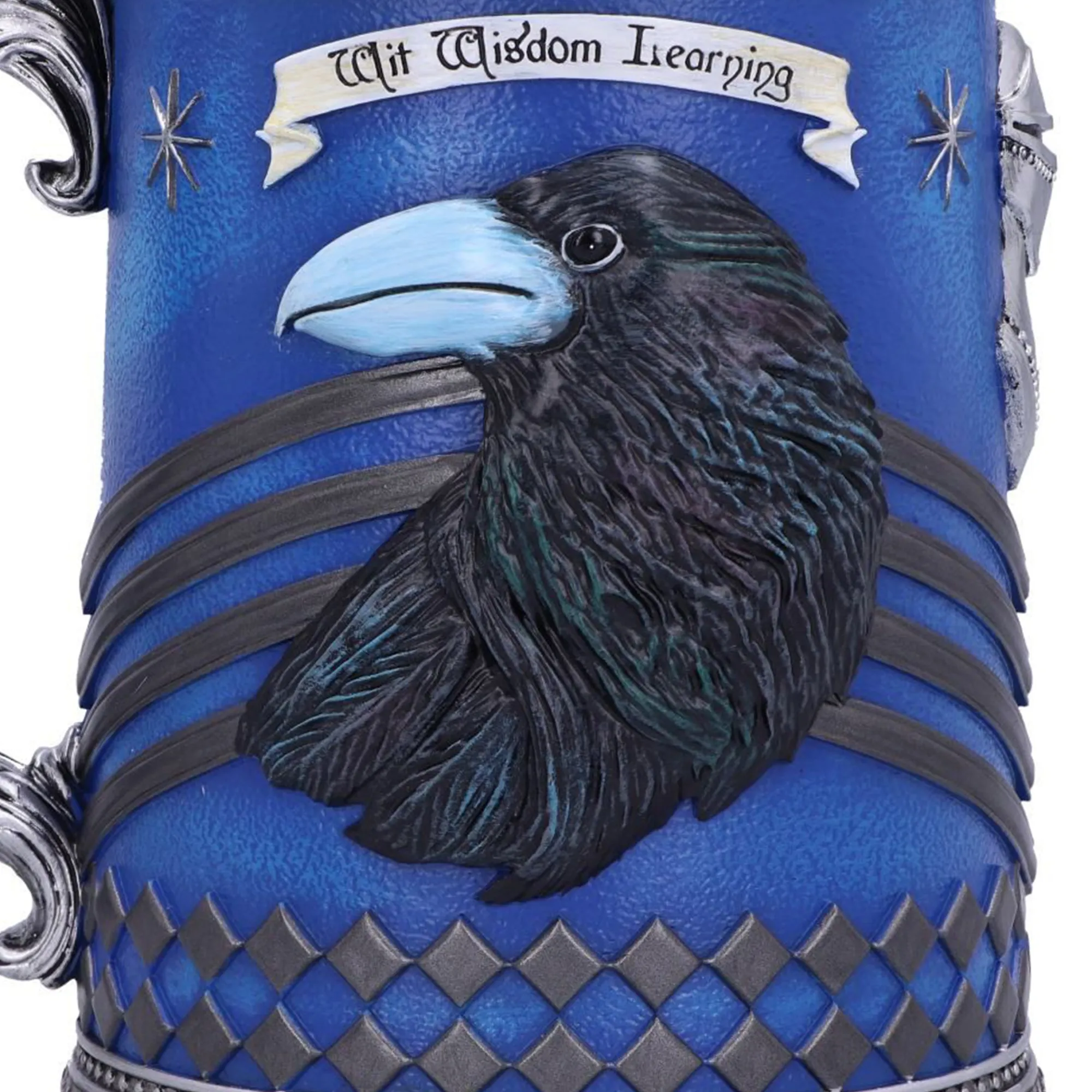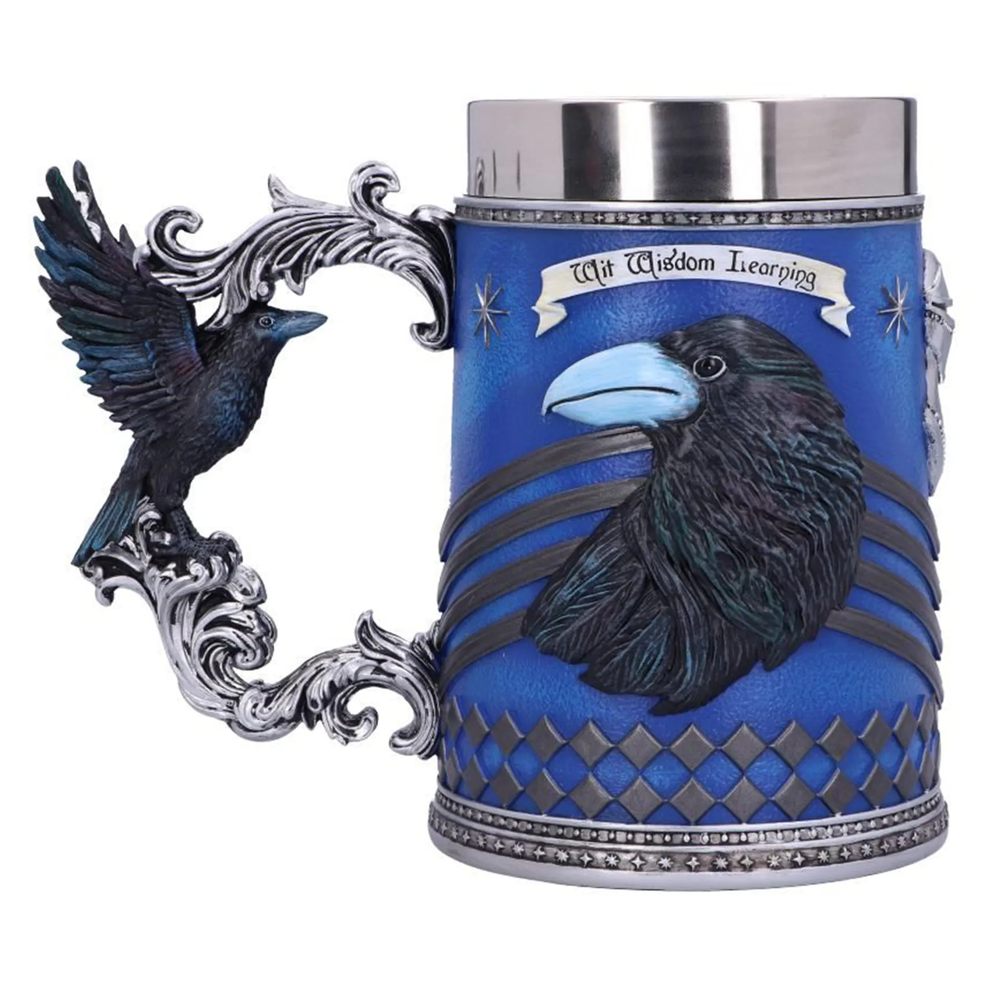 - Der Ravenclaw Bierkrug und Weinkelch trägt die Ravenclaw-Hausfarbe Blau. Kelch und Krug zeigen das Hauswappen und das Wappentier aus den Filmen, den Raben. Der Henkel bzw. Stiel ist ebenfalls einem Raben nachempfunden. Beide Gefäße sind mit Sternen, blauen Steinen, und weiteren Details verziert. Auf dem Bierkrug stehen außerdem die 3 Haupteigenschaften bzw. -werte der Ravenclaws.