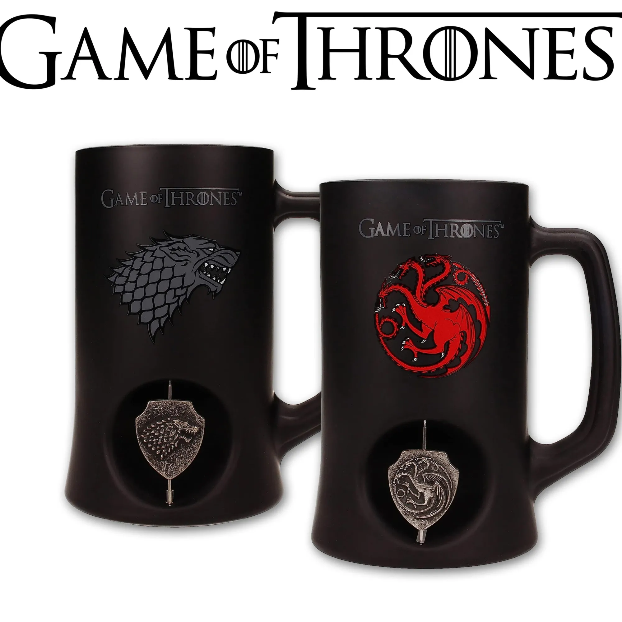 - Bierhumpen mit den Wappen der Häuser Stark und Targaryen aus der Serie „Game of Thrones“