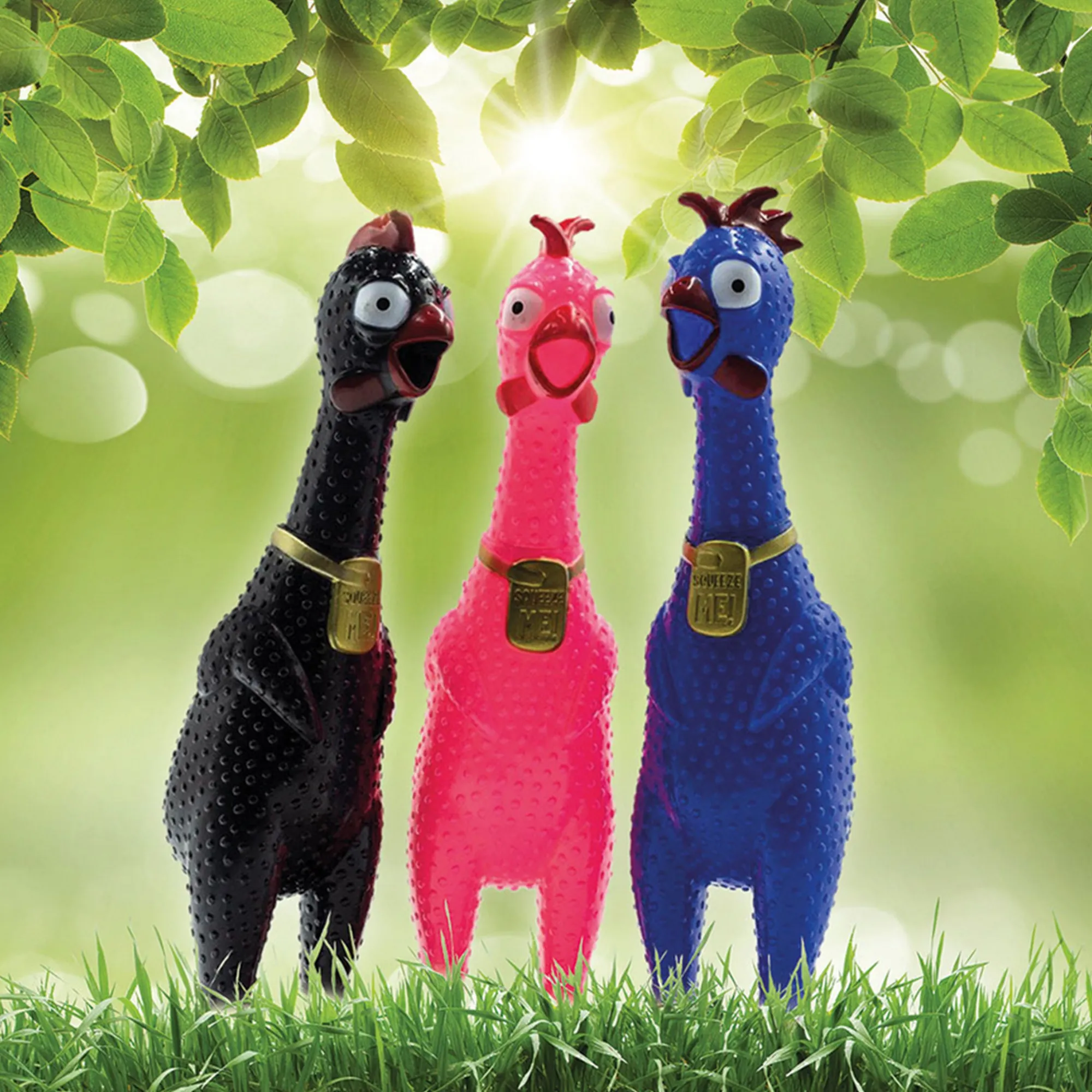 Die Farbe des Huhns ist übrigens rein zufällig und sagt nichts über die Qualität seiner Schreie aus. Die beeinflusst nur du selbst, indem du das arme Tier mal fester oder weniger fest drückst.