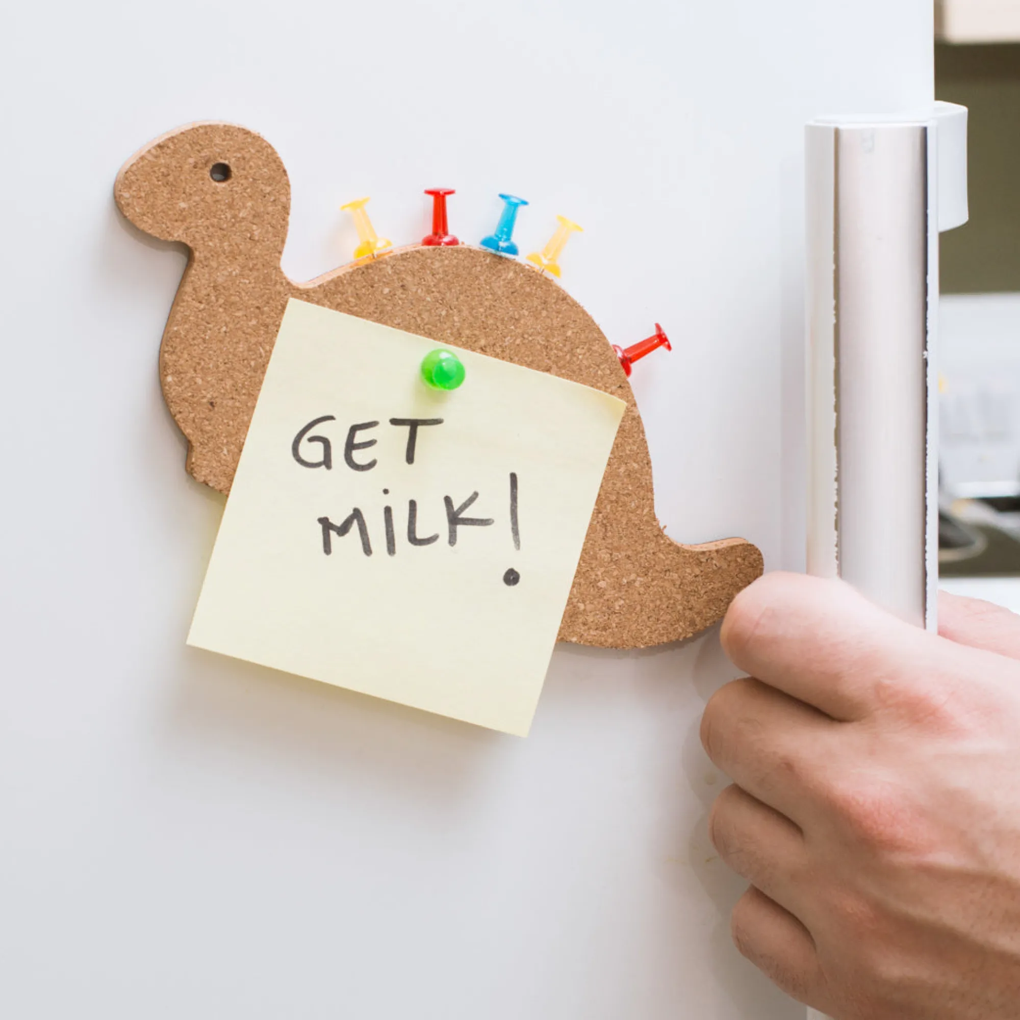 Damit dir das nicht passiert, kannst du auf der Magnetischen Kork-Pinnwand – Dinosaurier alle wichtigen Termine, Erinnerungen und Notizen anpinnen. Dank der magnetischen Rückseite haftet die Pinnwand beispielsweise am Kühlschrank oder anderen magnetischen Oberflächen. So niedlich und nerdig, wie dieser Pinn-Dino aussieht, guckst du ab sofort bestimmt öfter darauf. So entgeht dir kein wichtiger Termin mehr und du denkst bestimmt bei jedem Einkauf an alle Zutaten.