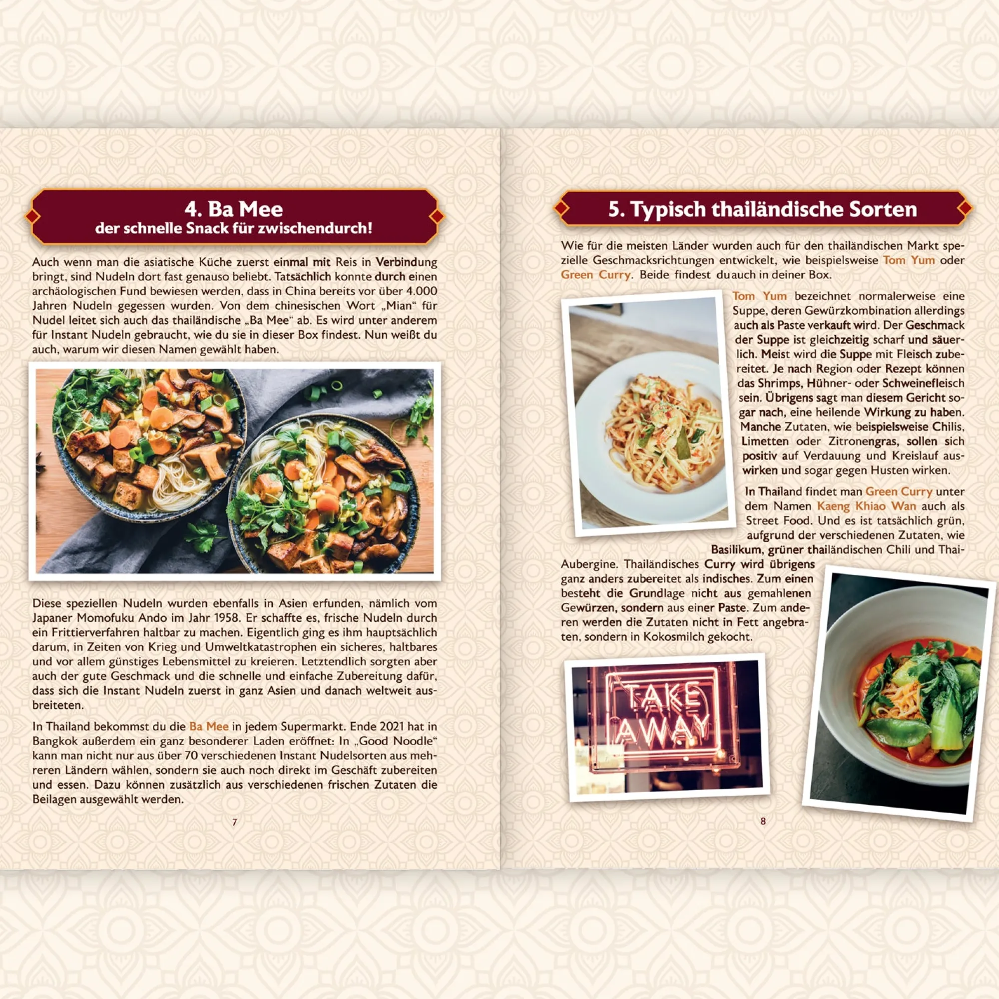 Die beiliegende 20-seitige Broschüre verrät dir verschiedene Rezeptideen – unter anderem, wie du mit Erdnussbutter oder Ingwer den frischen Street-Food-Geschmack zuhause erreichen kannst. Zusätzlich erfährst du spannende und interessante Hintergrundinfos zur thailändischen Esskultur und Geschichte der Instant-Nudeln in Thailand.