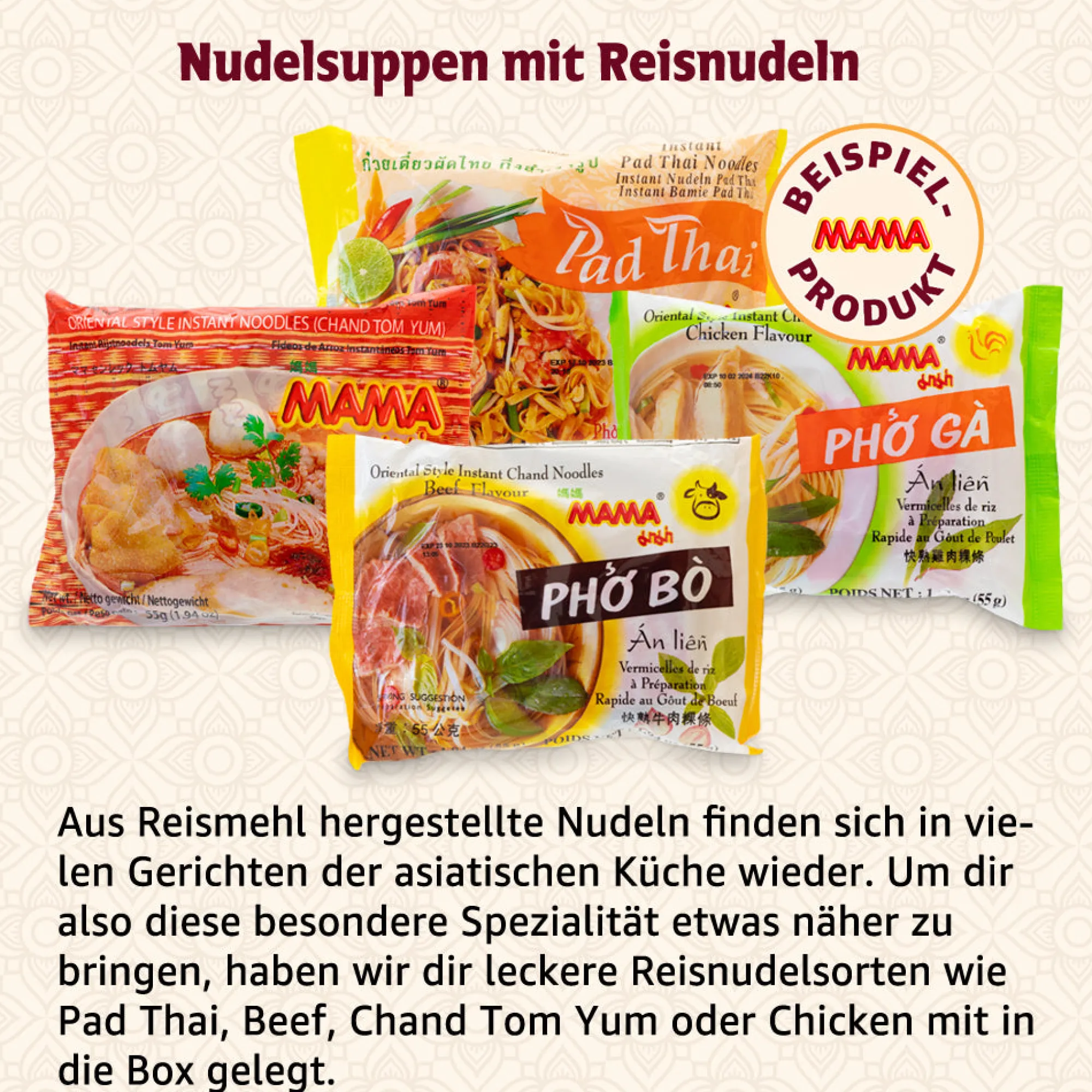 - Nudelbox mit 10 ausgewählten Sorten thailändischer Instant-Nudeln der Marke MAMA