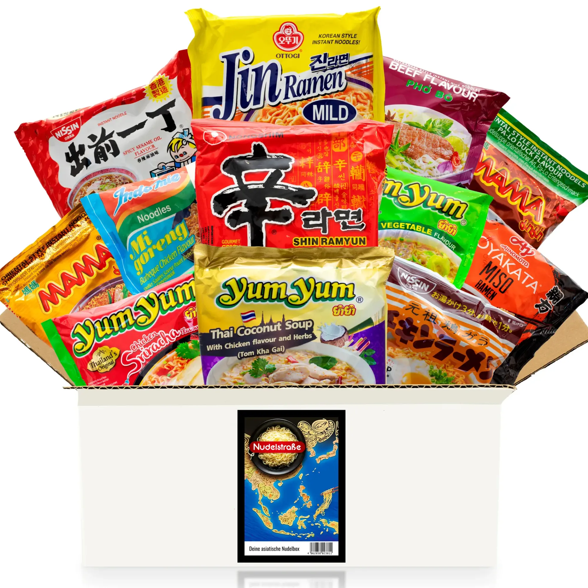 Diese werden von uns besonders sorgsam ausgewählt, damit du eine perfekte Kombination aus unterschiedlichen Geschmacksrichtungen und Marken kennenlernen kannst. Von thailändischem Tom Yum über japanische Miso-Suppe mit Soba bis hin zu typisch koreanischem Ramyun mit scharfer Chilisoße und indonesischem Mie Goreng ist für jeden Geschmack etwas dabei. Natürlich findest du auch Klassiker wie Chicken, Vegetable, Duck oder Sesam in der Box.