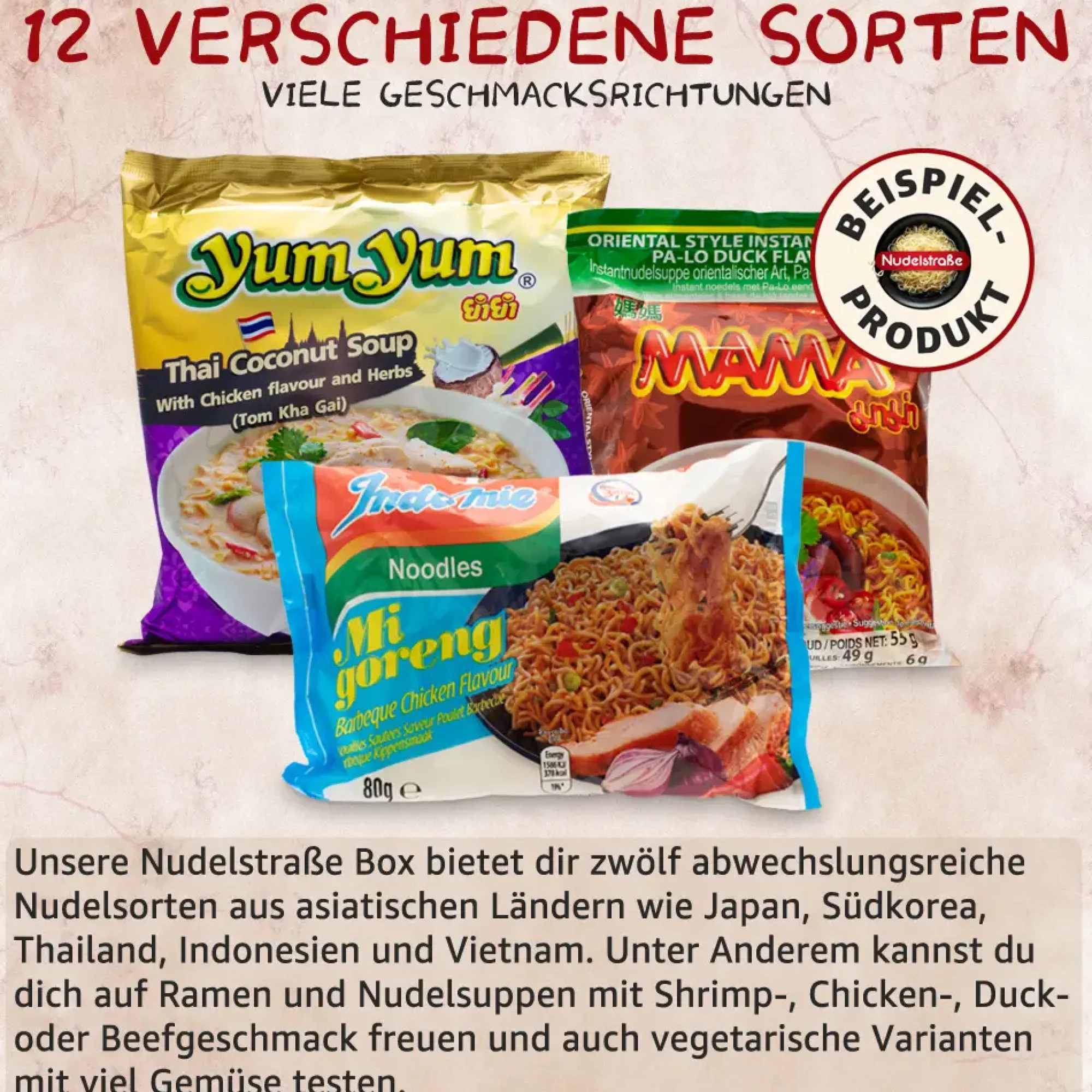 - Enthaltene Geschmacksrichtungen können u.a. Mie Goreng, Sesam, Tom Yum oder Hühnchen sein