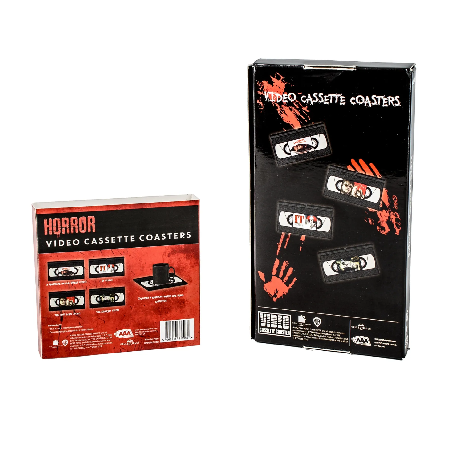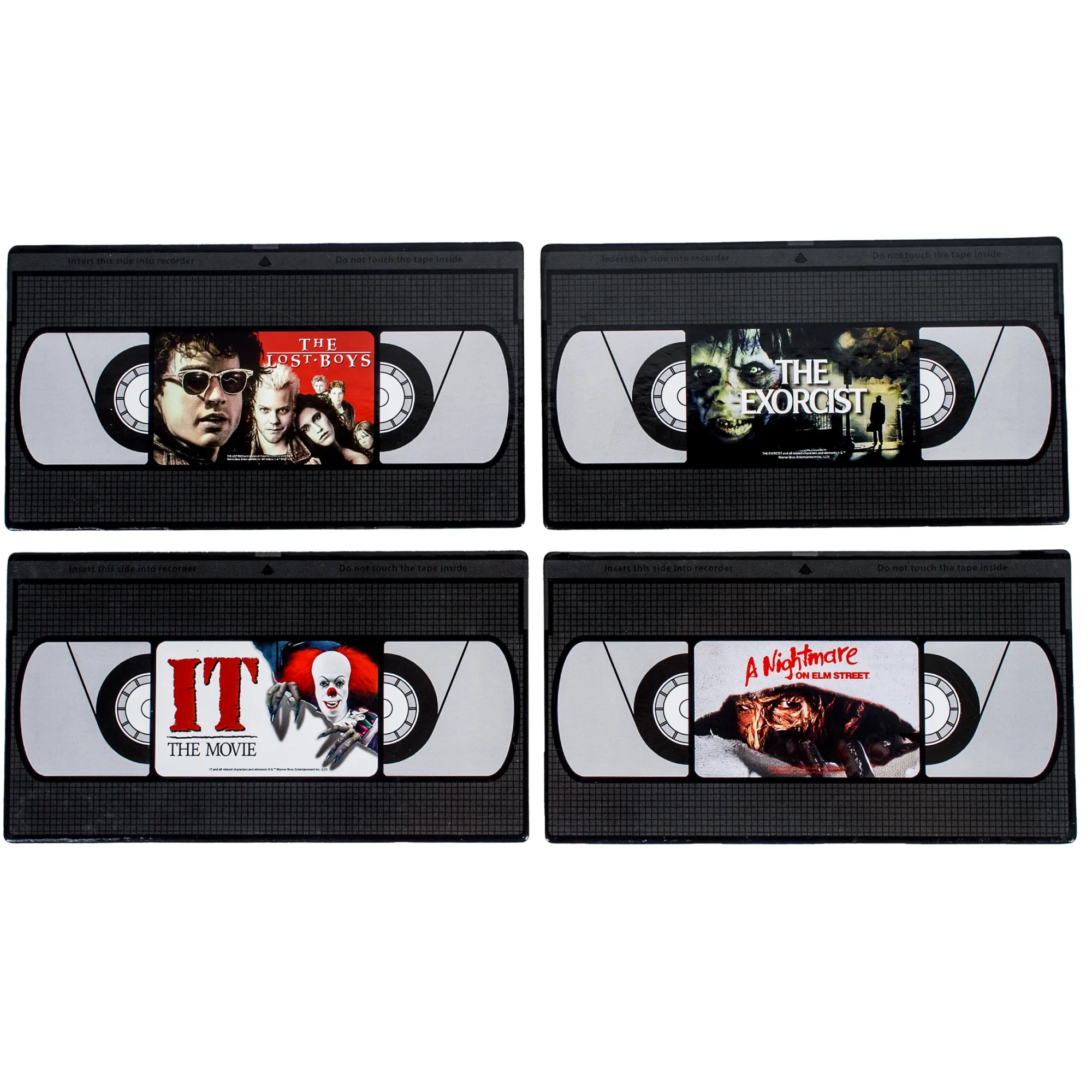 Dieses Set enthält 4 Korkuntersetzer im Stil von Videokassetten der Horror-Kultfilme IT, Nightmare on Elm Street, The Lost Boys und The Exorcist. Leider lassen sie sich nicht auf einem VHS-Rekorder abspielen.