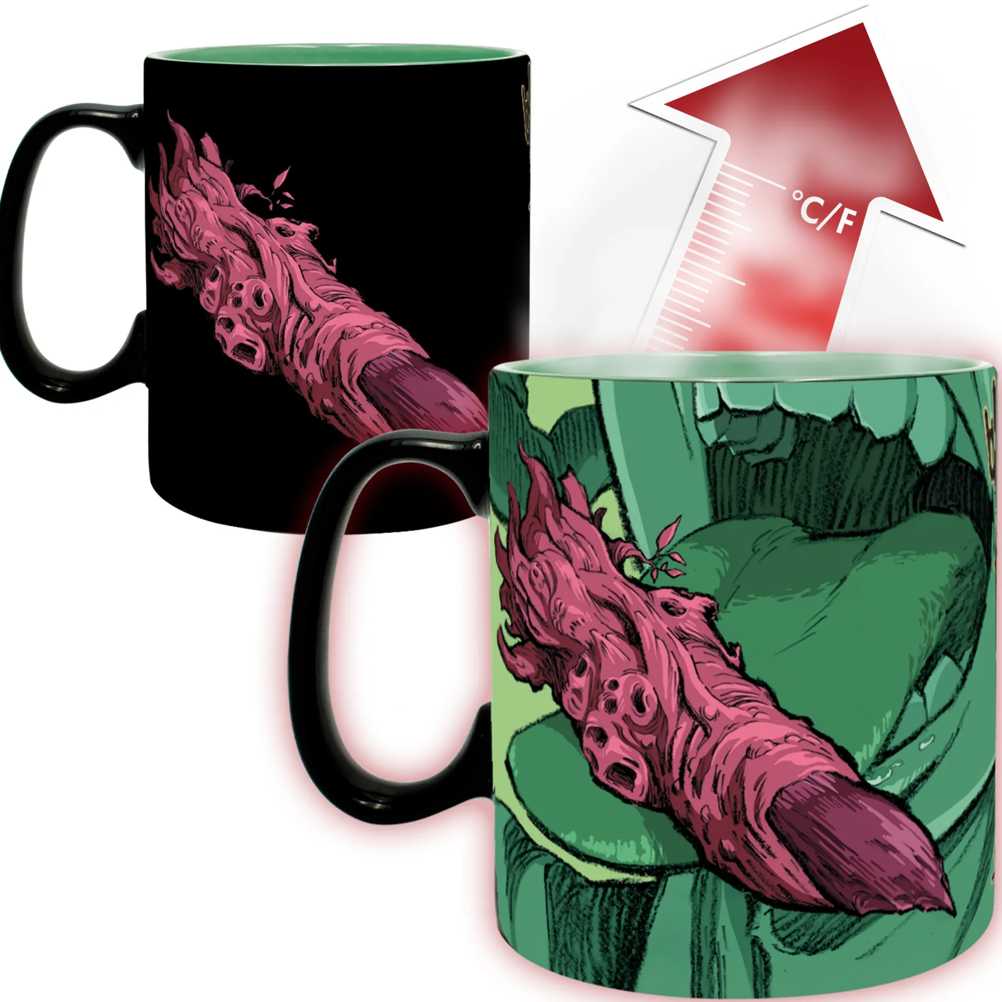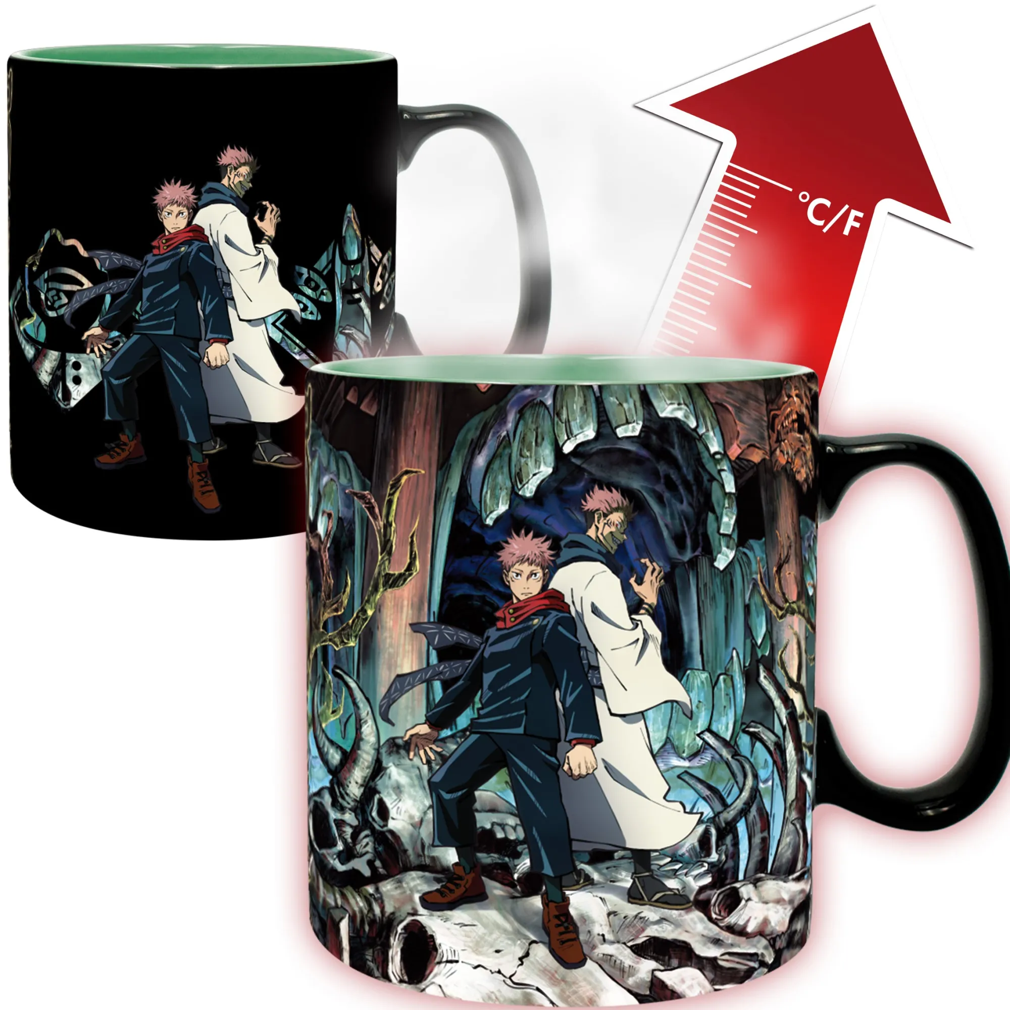 Dieser Becher hält ein düsteres Geheimnis bereit! Der Jujutsu Kaisen Thermo-Effekt Becher „Itadori & Sukuna“ zeigt Yuji Itadori und den Fluchgeist Sukuna. Beim Einfüllen heißer Getränke enthüllt sich jedoch ein unheilvoller Hintergrund, welcher die düstere Atmosphäre des beliebten Animes einfängt.