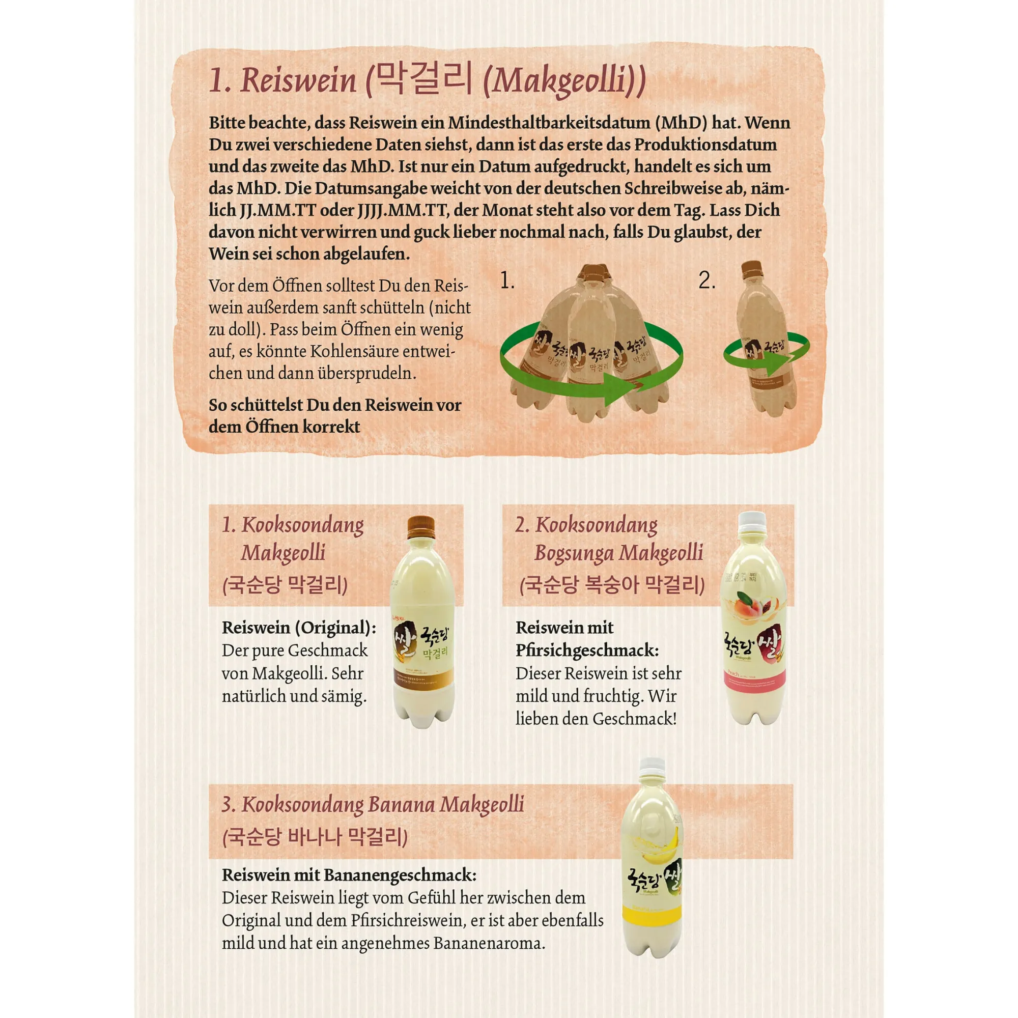 Natürlich wollen wir Dich nicht unvorbereitet auf diese Köstlichkeiten loslassen. Deshalb liegt der Sulsul-Box auch ein 14-seitiges Heft bei, in dem Du Infos über die Getränke und die koreanische Trinkkultur im Allgemeinen findest. Neben Musik-Tipps darfst Du Dich auch auf passende Gerichte aus der koreanischen Küche und ungeschriebene Gesetze freuen, die beim Trinken von Alkohol befolgt werden sollten. Und selbstverständlich darf auch das ein oder andere Trinkspiel nicht fehlen!