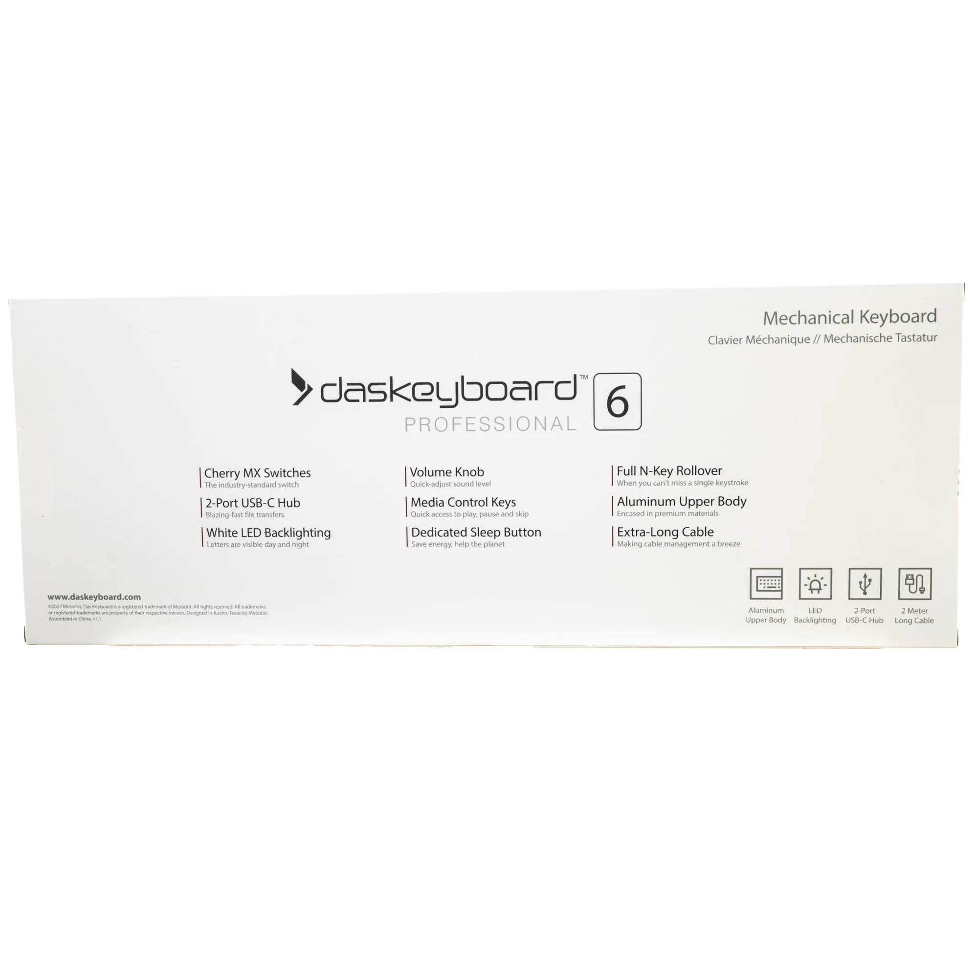 - Erhältlich mit deutschem, britischem oder US-amerikanischem Tastenlayout und mit blauen (taktil, deutliches Klicken) oder braunen (taktil, leises Klicken) Schaltern