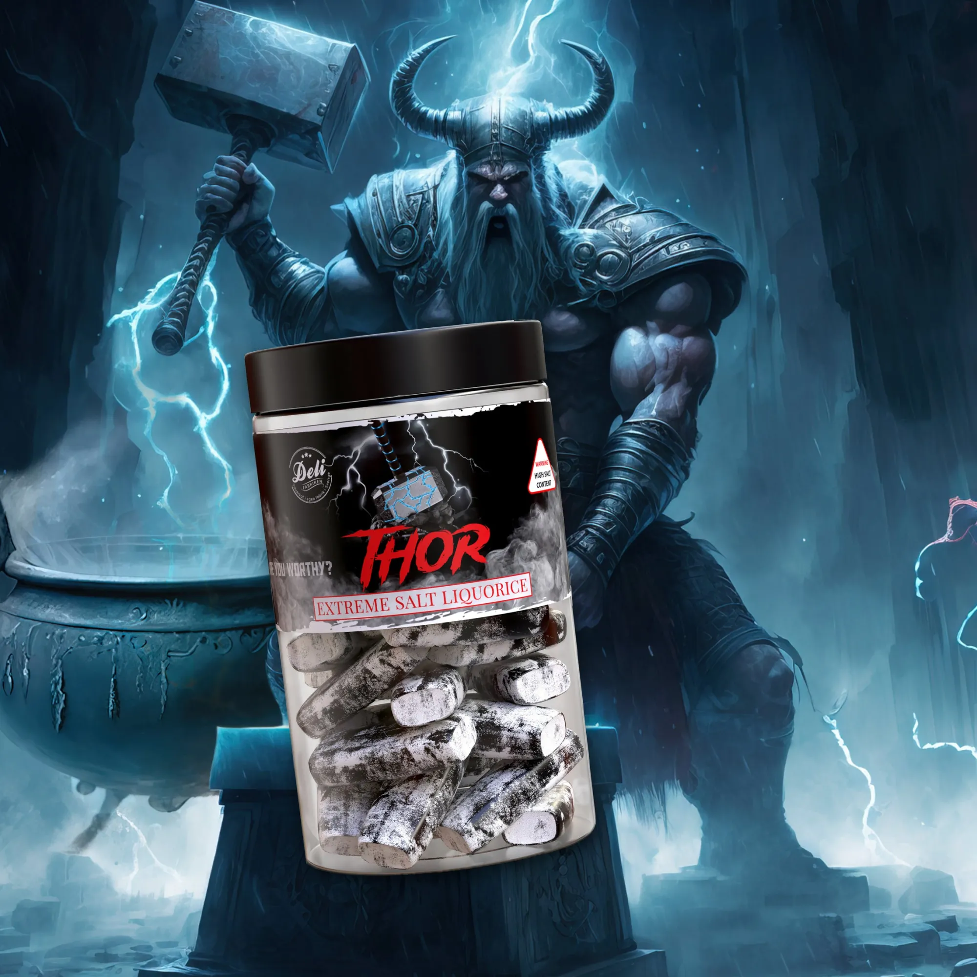 Thor, der hammerschwingende Donnergott, ist neben seinem Vater Odin der mächtigste und furchteinflößendste unter den skandinavischen Gottheiten. Doch selbst er würde davor zurückschrecken, das Extreme Salzlakritz aus Schweden zu probieren!
