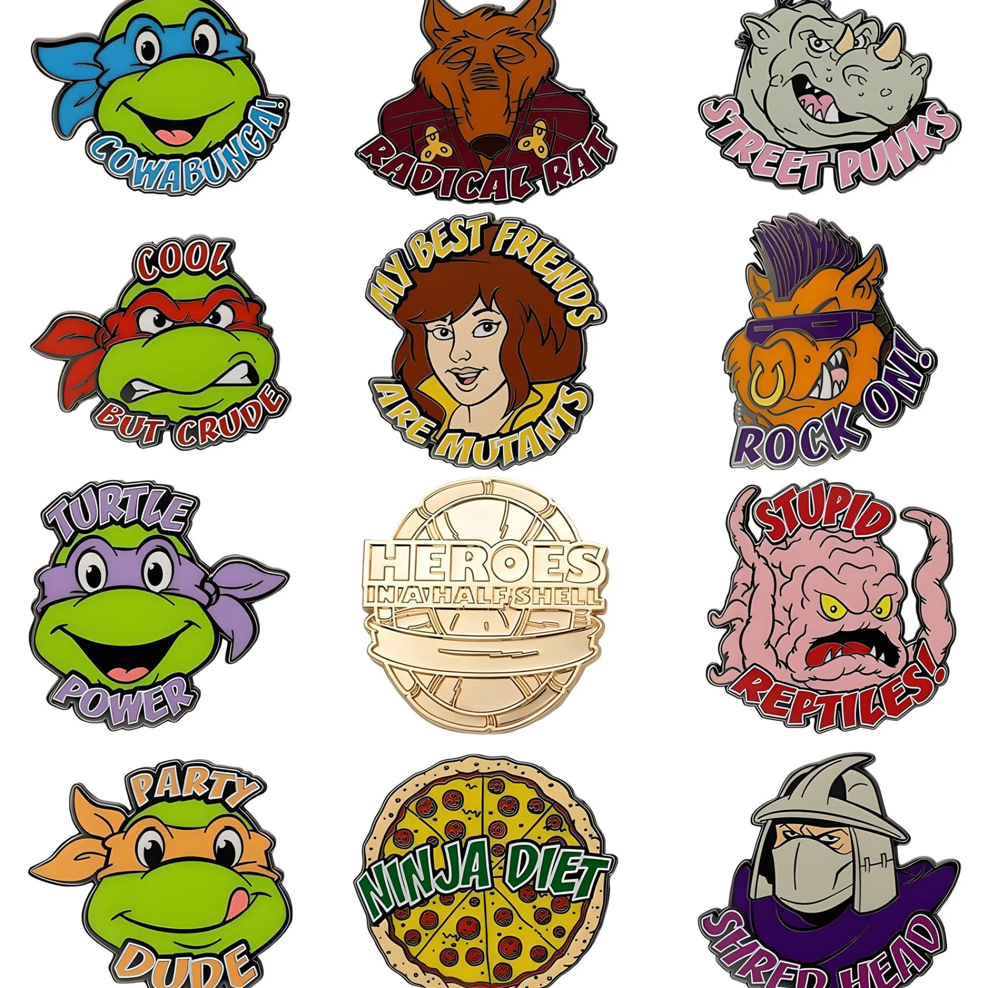 Es erwartet dich einer von 12 unterschiedlichen Pins, allesamt aus hochwertigem Metall gefertigt, mit Emaille beschichtet und aufwendig geprägt. Mit dabei sind natürlich die vier Turtles Leonardo, Raphael, Donatello und Michelangelo, aber auch ihre Freunde und Erzfeinde wie Splinter, April, Shredder, Krang oder Rocksteady & Bebop. Sogar ein goldener „Heroes in a Half Shell“-Pin ist mit etwas Glück als seltener Sammler-Schatz enthalten! Jeder Anstecker strotzt nur so vor Retro-Vibes und ist bereit, Jacke, Rucksack oder Pinboard zu gehörig aufzuwerten.