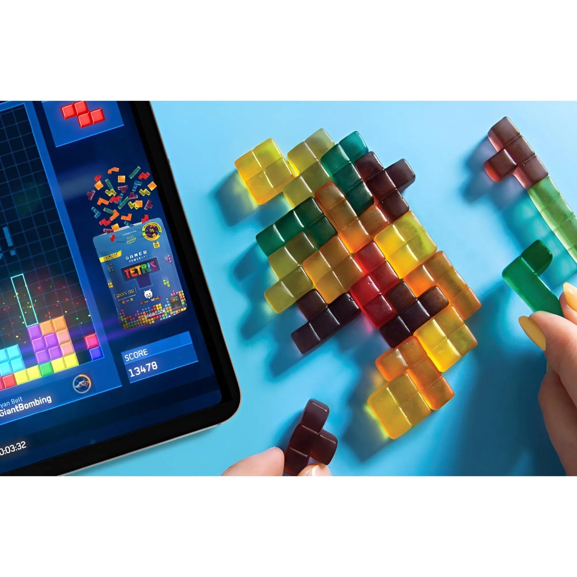 - Fruchtgummis mit Vitamin C, E und 20 % Fruchtsaftgehalt in Tetrimino-Formen aus dem Spiel Tetris
