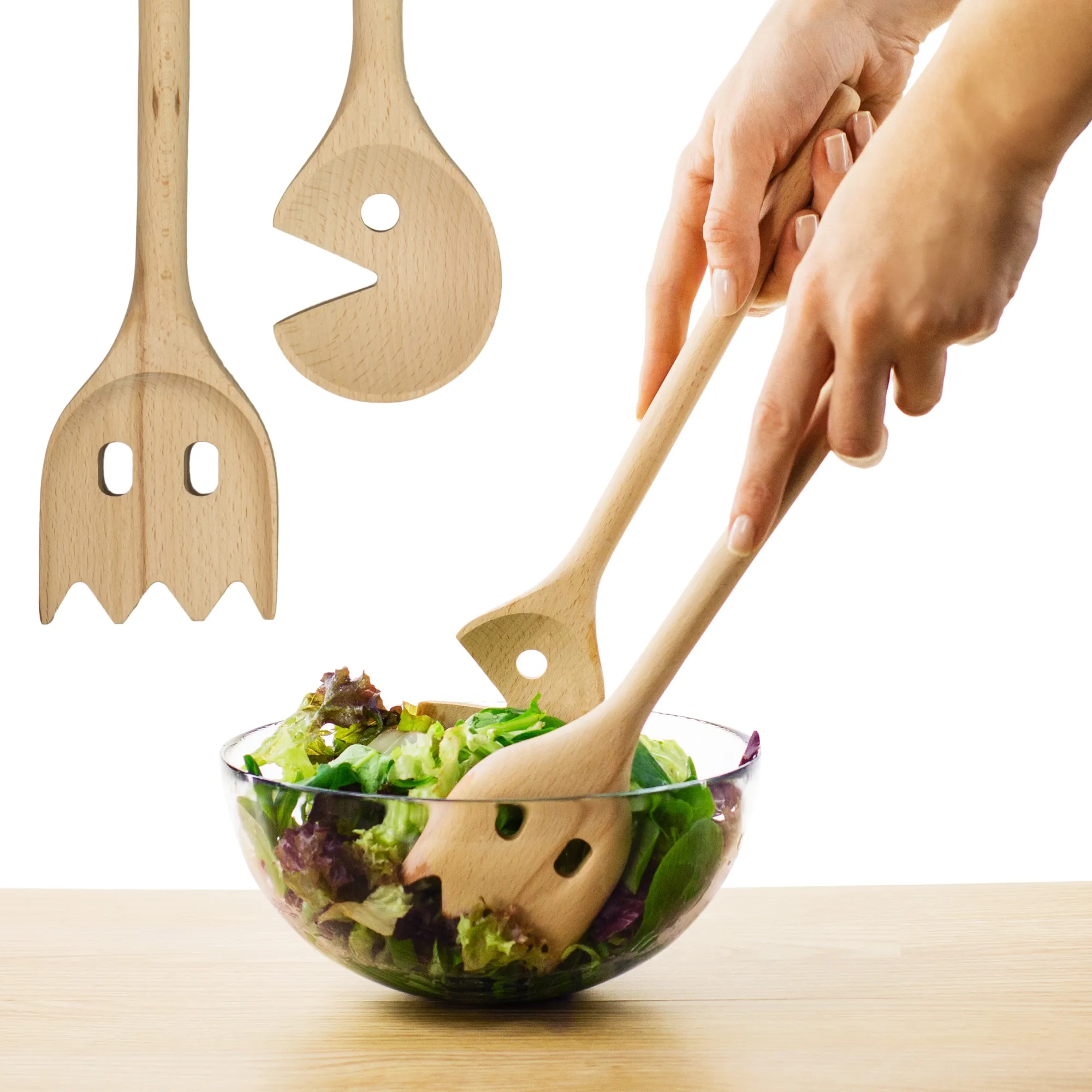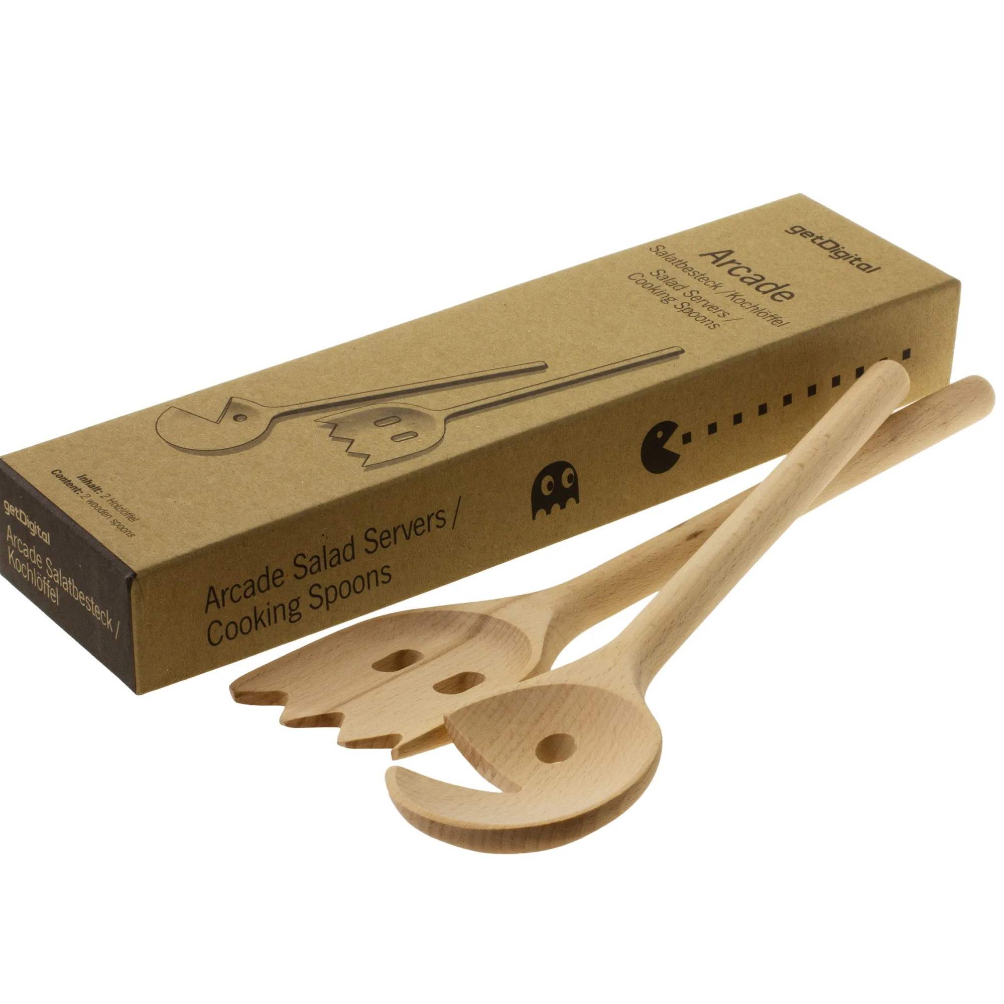 Falls Du noch nicht so ganz überzeugt bist, kann unser Arcade-Holzlöffelset Dich vielleicht überzeugen. Diese aus Buchenholz gefertigten Löffel bringen einen gefräßigen Kreis und einen Geist aus der goldenen Zeit der Arcade-Spiele in die Küche und können Dir helfen, Deine Furcht vor dem Grünzeug zu überwinden. Solltest Du ähnlich fundamental in Deinen Ansichten sein wie einige unserer Kollegen, kannst Du aber auch Kartoffelsalat, Bacon oder Steaks mit den Löffeln hin- und herschaufeln. 😉 Es lässt sich damit natürlich auch ganz hervorragend in dampfenden Kochtöpfen rühren.