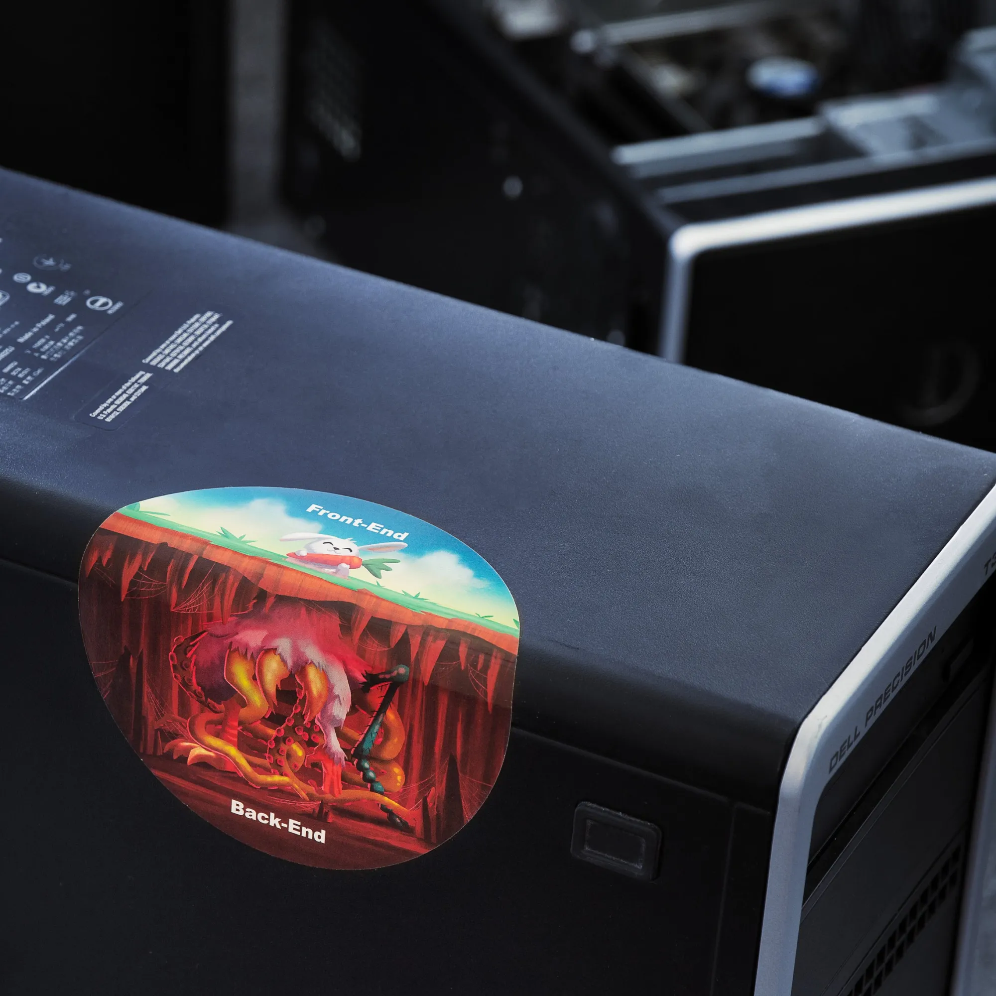 Der „Front-End / Back-End“-Aufkleber zeigt genau solch ein Monster. Auf den ersten Blick sieht man nur ein niedliches Kaninchen, das eine Möhre hält und nichts Böses im Schilde führt. Unter der Oberfläche lauert aber ein abscheuliches Monster, das selbst Frankensteins Kreatur in den Schatten stellt. Zum Glück gibt es ja tapfere Coder, die sich ins Gefecht stürzen und – nun ja – alles noch schlimmer machen. 😉