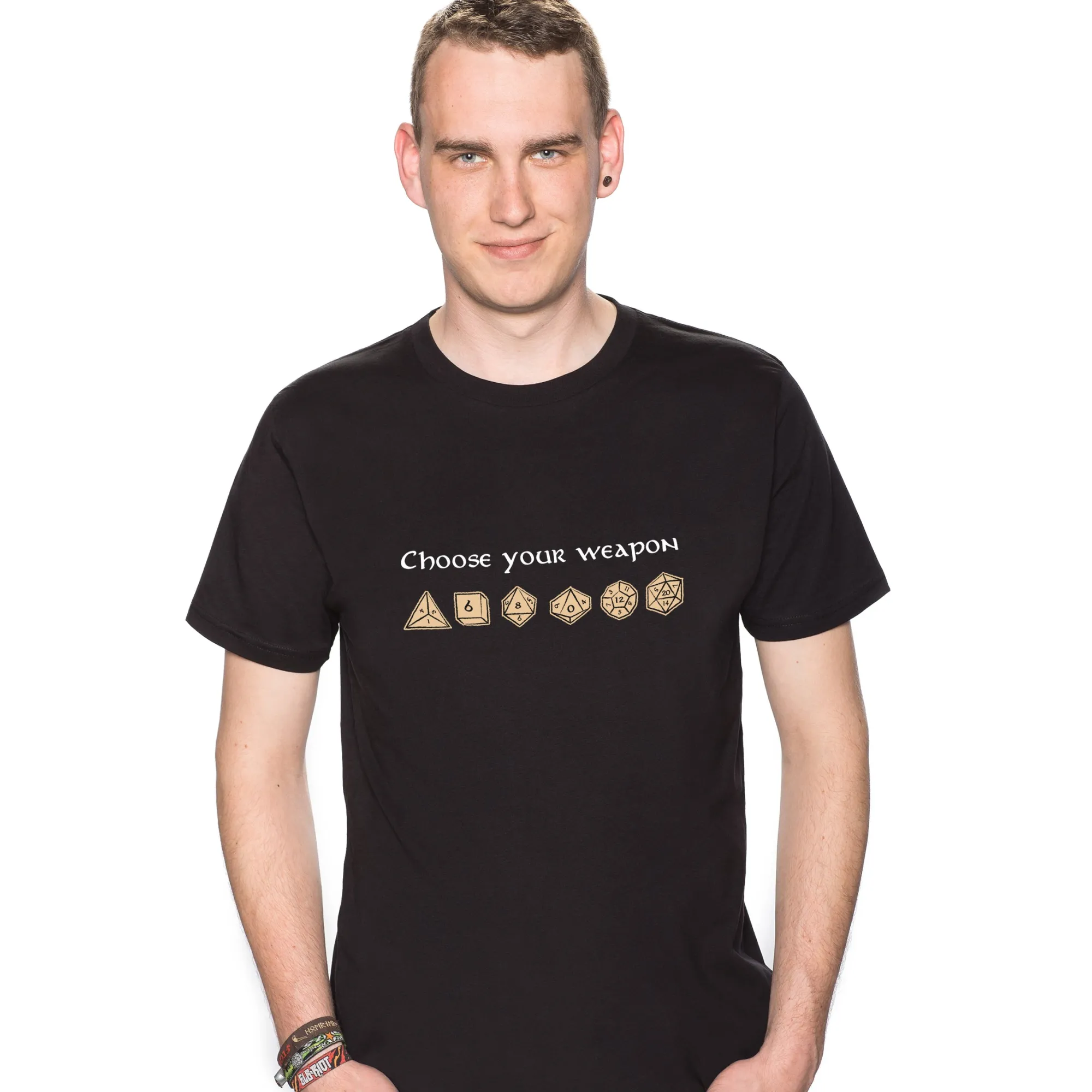 Dann werden Würfel für Dich wahrscheinlich auch eine fast schon mystische Bedeutung haben – entscheiden sie doch über Leben und Tod Deines Helden und dessen Gegner. Wenn Deine bevorzugte Waffe also auch der Würfel ist, dann führt eigentlich kein Weg an dem Choose your weapon (Wähle Deine Waffe) Shirt vorbei.