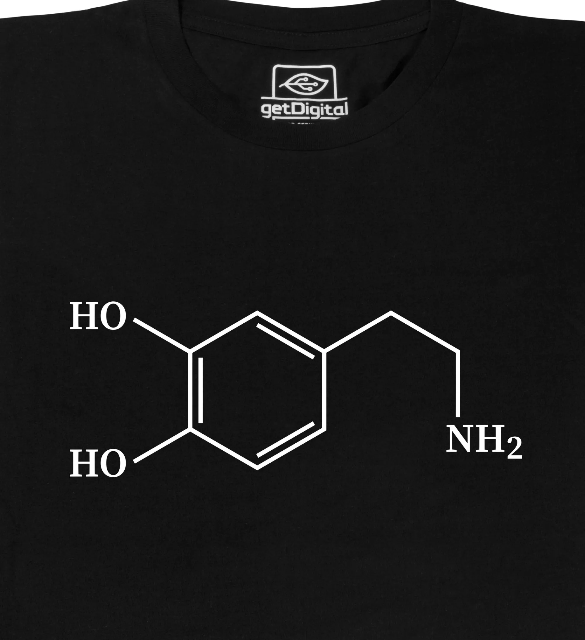 Und irgendwie ist es doch auch unfair, den auf dem Dopamin-T-Shirt abgebildeten Neurotransmitter [i]Dopamin[/i] auf etwas so Schwammiges wie „Glück“ zu reduzieren. Ganz abgesehen davon, dass Glück hochgradig subjektiv ist, legen neuere Forschungsansätze nahe, dass Dopamin eher motivations- und antriebsfördernd ist – aber wahrscheinlich klingt „Antriebshormon“ nicht so toll wie „Glückshormon“. Das ändert natürlich nichts daran, dass Dopamin eine tolle Sache ist und dieses T-Shirt Nerds mit einer Vorliebe für Neurotransmitter glücklich machen kann. Ach Mist, jetzt haben wir es ja selbst gesagt… 😉