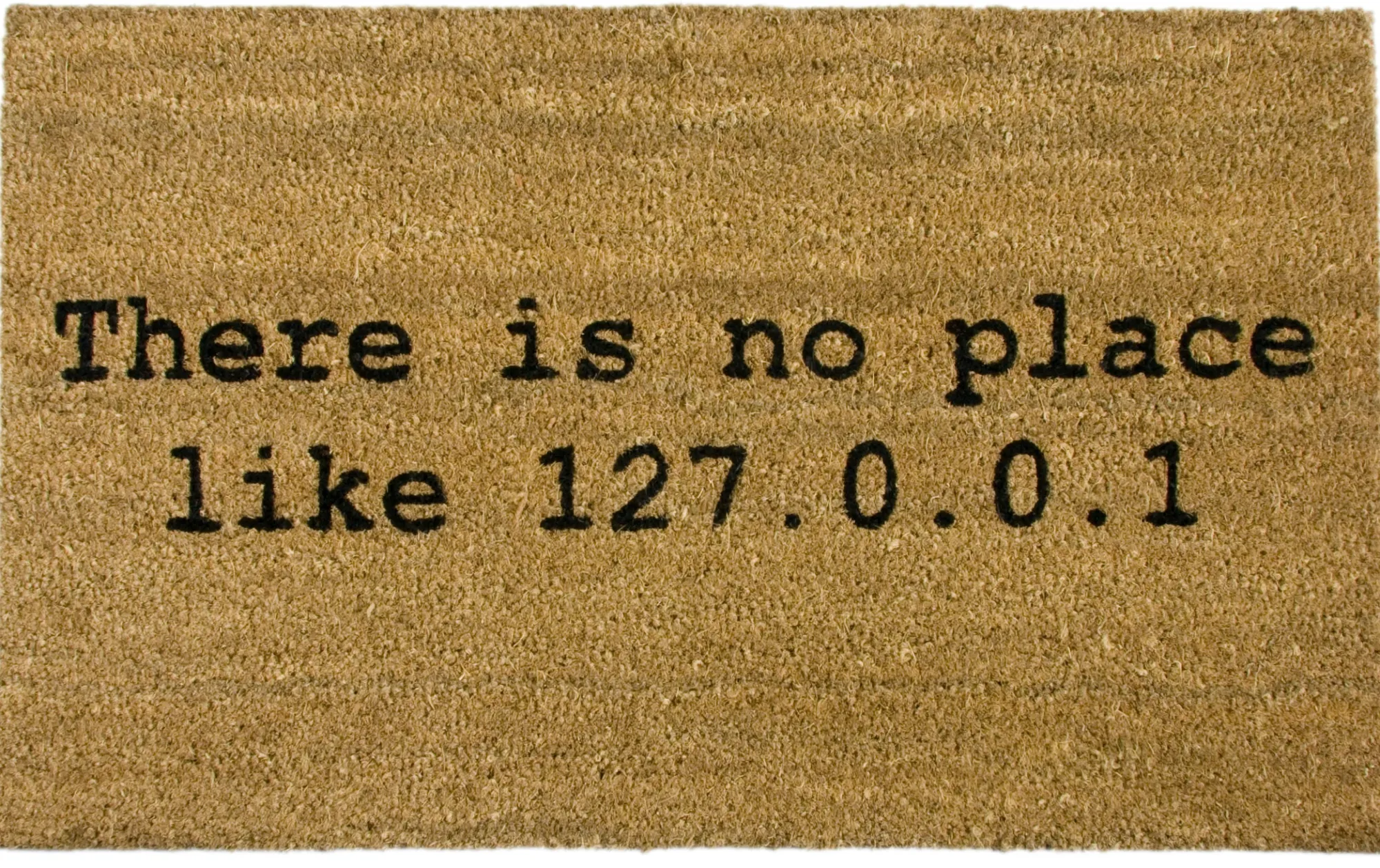 Aus der Computersprache übersetzt steht auf der Fußmatte in etwa „There is no place like home“ zu deutsch „Zuhause ist es am Schönsten“. Zur Erklärung: Die Zahlenreihe ist eine IP-Adresse, mit einer Postanschrift vergleichbar. Mit der Kennung 127.0.0.1 bezeichnet sich jeder Computer selbst, sie entspricht also der eigenen Postadresse.