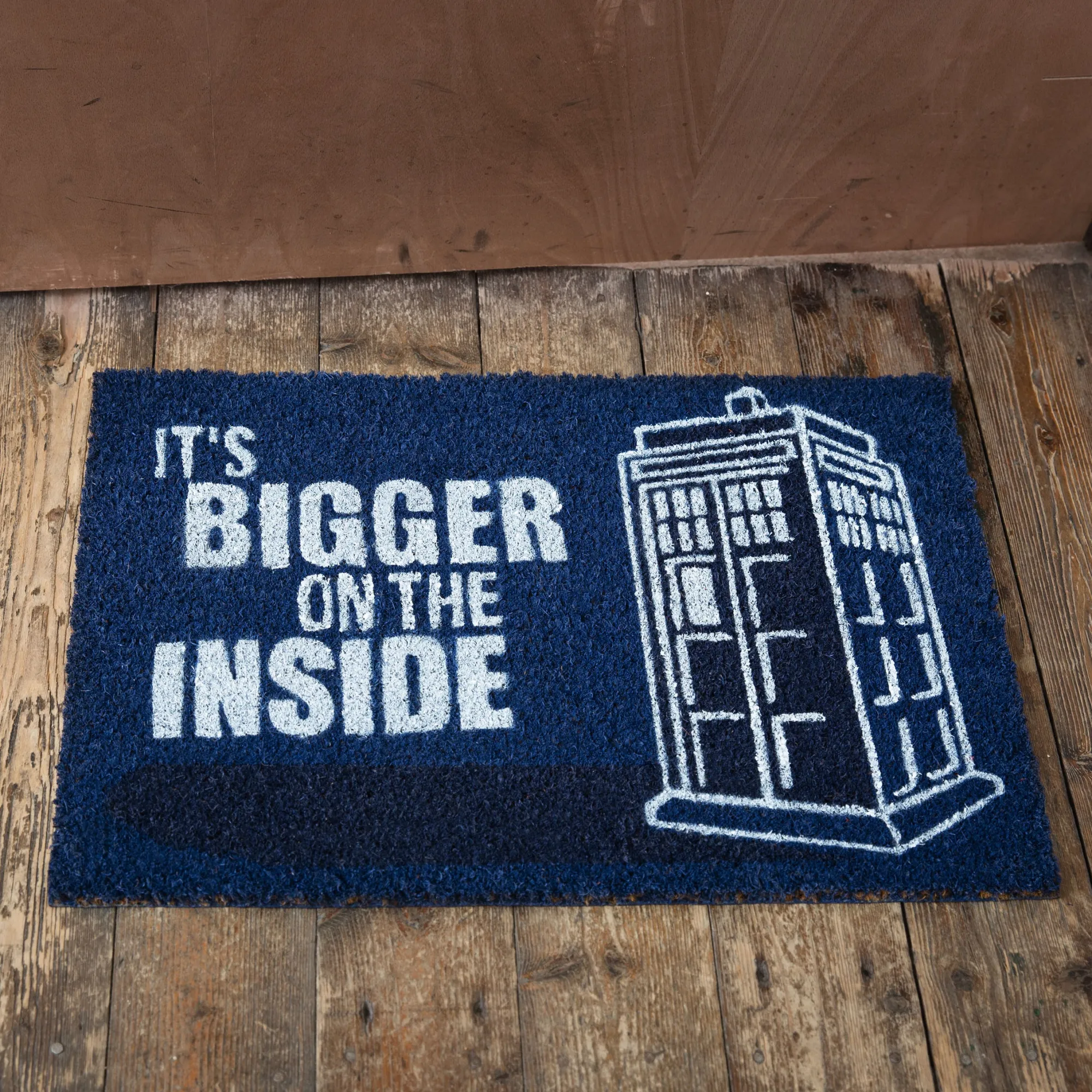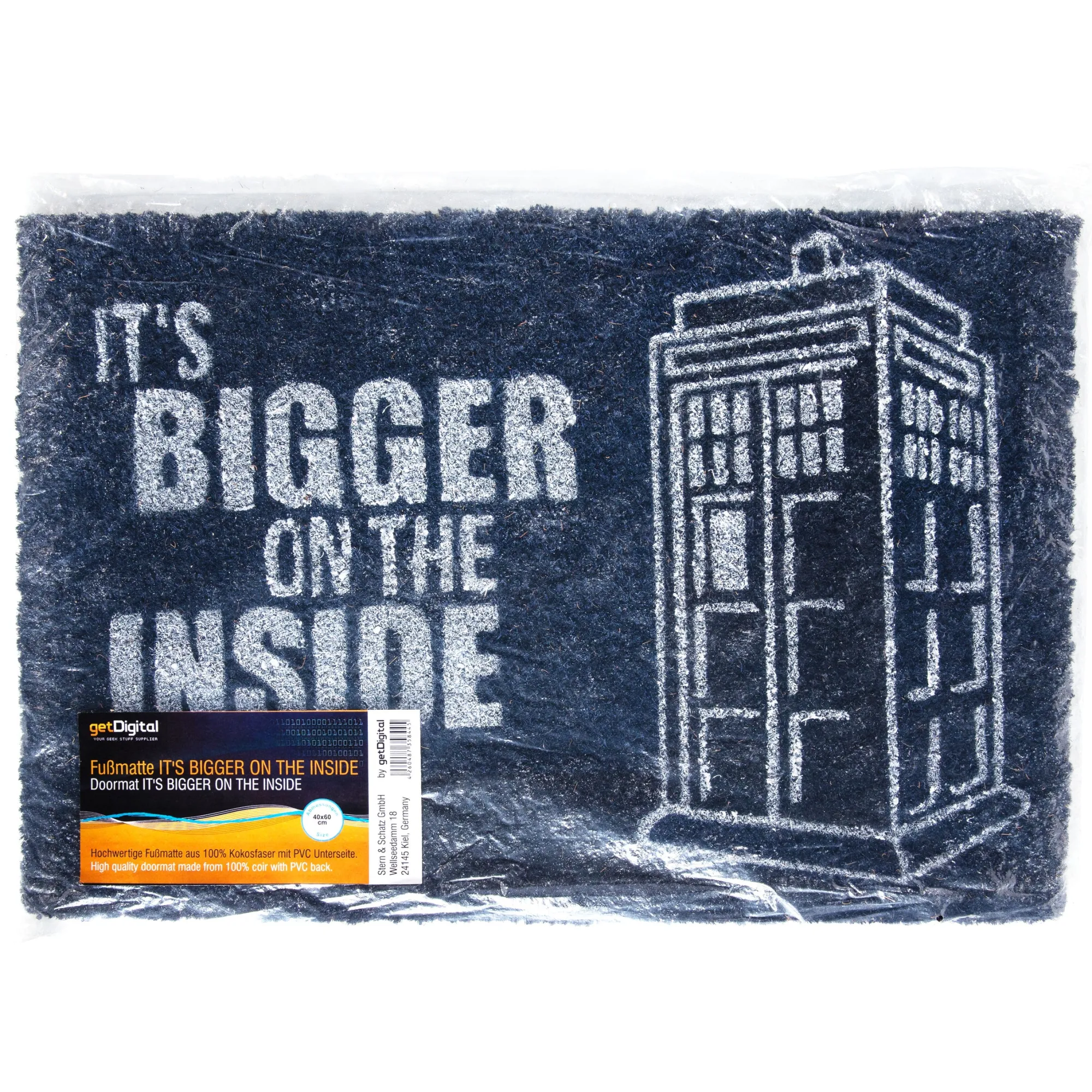 Die „It’s bigger on the inside“-Fußmatte ist die Lösung des Problems! Denn sobald Du die Polizeibox, die auf der Matte aus Kokosfasern zu sehen ist, startest, hast Du Platz ohne Ende! Warum? Wie wir aus einer extrem erfolgreichen TV-Serie wissen, ist diese Box in Wahrheit ein zeitreisendes Raumschiff, das von innen größer ist! Jetzt musst Du nur noch den leicht durchgedrehten Bewohner der Box vertreiben…