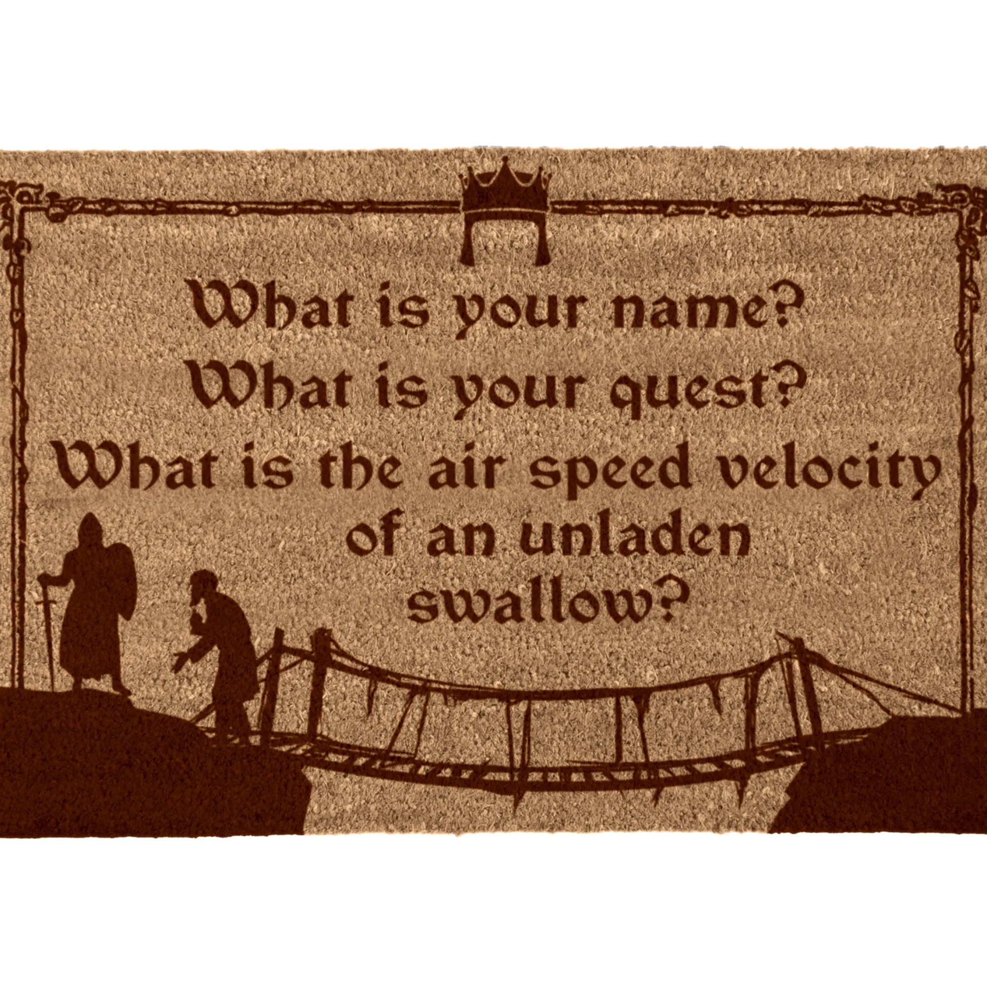 Somit bietet die Fußmatte What is your name den perfekten Anlass, unerwünschten Besuch direkt an deiner Tür auszusortieren. Wer den Kultfilm nicht kennt, darf direkt wieder umkehren. Alle übrigen können sich daran versuchen, die drei Fragen auf der Matte korrekt zu beantworten. Du selbst bist hoffentlich etwas schlauer als der Brückenwächter im Film und weißt, dass es sich um eine europäische Schwalbe handelt. Sie bewegt sich normalerweise mit einer Geschwindigkeit von ca. 32,4 km/h fort. Wobei Antworten bis zu 74 km/h ebenfalls als richtig angesehen werden können, da einzelne Schwalben tatsächlich mit einer solchen Geschwindigkeit gemessen wurden. Ob du andere Antworten du zulässt und wenn ja welche, bestimmst du selbst. 😉