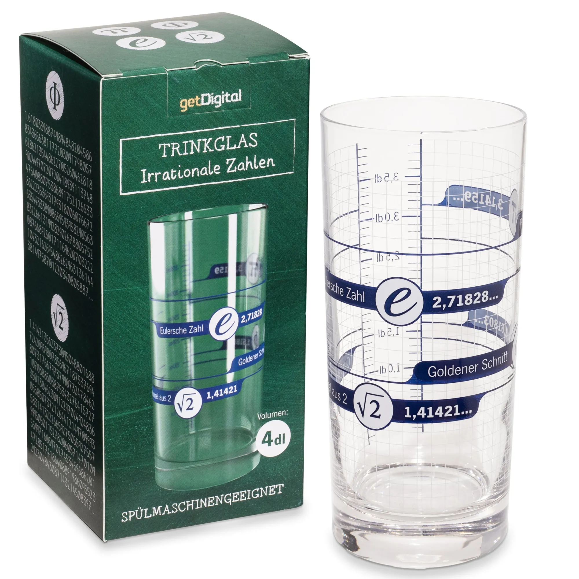 Denn das Irrationale Zahlen Trinkglas ist mit einer Skala in Deziliter versehen, und würdigt gleichzeitig vier irrationale Zahlen aus der Mathematik. Zum Beispiel kannst du demnächst bei ca. 1,41421 (Eulersche Zahl) dl Whiskey oder ca. 3,14159 (Pi) dl Limonade die Errungenschaften der Mathematik feiern. Die Angaben auf dem Glas umfassen für jede irrationale Zahl das Symbol, den Namen, und die Dezimalschreibweise bis auf 5 Nachkommastellen.