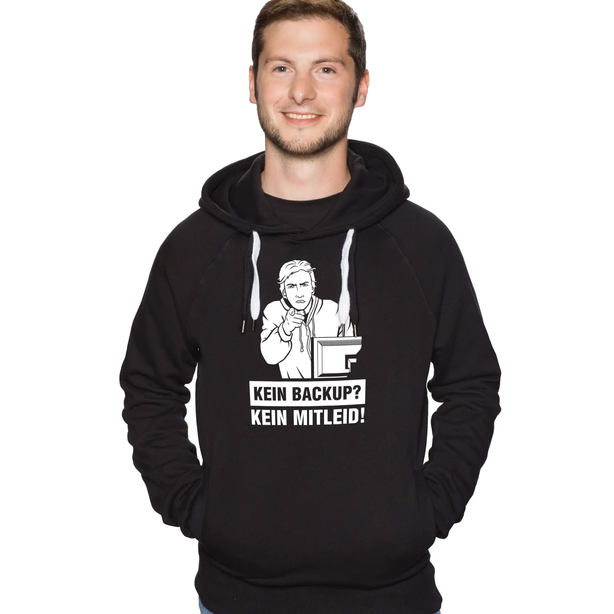 Wir finden: Selbst Schuld! Das „Kein Backup – Kein Mitleid“-Shirt zeigt klar und deutlich, was man in so einem Fall von der IT-Abteilung erwarten kann: Ein müdes Grinsen und ganz bestimmt kein Mitgefühl! Beim nächsten Mal also regelmäßig Kopien erstellen, das spart allen beteiligten jede Menge Zeit und Nerven. Man sagt ja nicht umsonst: [i]“Save early, save often!“[/i] 😉