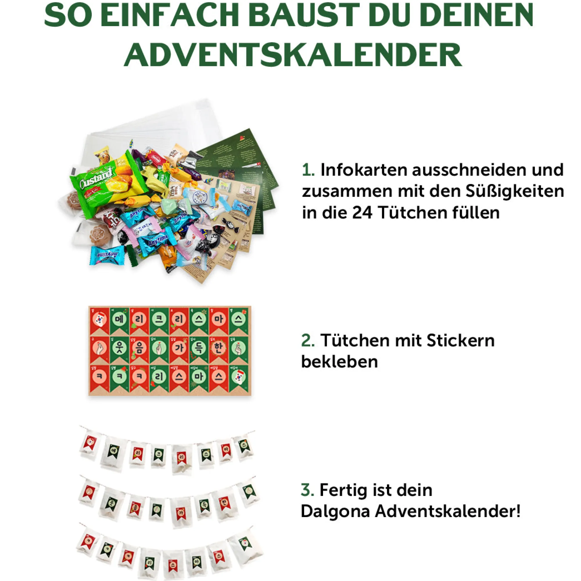 Mit dem Dalgona-Süßigkeiten-Adventskalender bringen wir jede Menge leckere Süßigkeiten direkt aus Korea zu Dir nach Hause: Dich erwarten 24 Tüten, die Du mit insgesamt 42 ausgewählten koreanischen Köstlichkeiten füllen kannst, um anschließend einer anderen Person ein Freude zu machen.