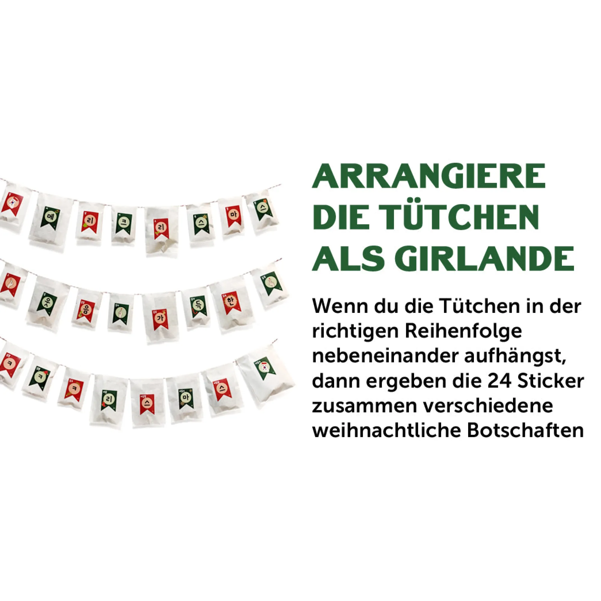 Damit die Tüten auch in der richtigen Reihenfolge geöffnet werden, liegen 24 weihnachtliche Aufkleber bei, die sowohl koreanische als auch arabische Zahlen zeigen und verschiedene koreanische Worte mit weihnachtlichem Bezug ergeben, wenn sie wie eine Girlande nebeneinander aufgehängt werden.