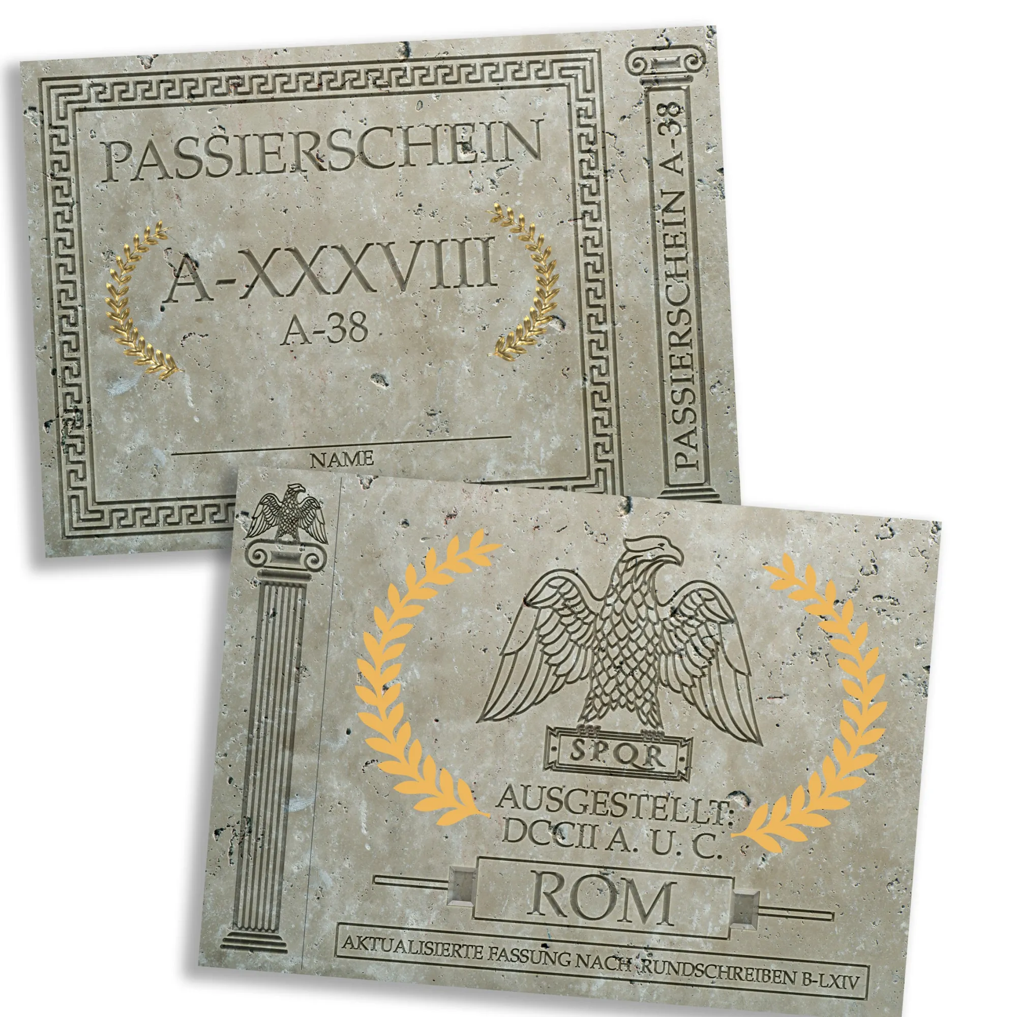 Seine Belohnung: der legendäre Passierschein A38 im Zehnerpack! Dieses sagenumwobene Schriftstück mussten die Gallier als Teil eines Wettkampfs mit Caesar in ihren Besitz bringen, was ihnen mit einer List auch gelang. Damit Du Dich nicht durch die Hölle der römischen Bürokratie kämpfen musst, findest Du in diesem Set gleich zehn Exemplare des Passierscheins in der aktualisierten Fassung nach Rundschreiben B-LXIV. Die goldenen Lorbeerkränze lassen direkt erahnen, dass Du ein wahrlich wichtiges Stück Geschichte in den Händen hältst. Und keine Sorge, den Passierschein A39 nach Rundschreiben B65 musst Du uns natürlich nicht vorlegen. 😉