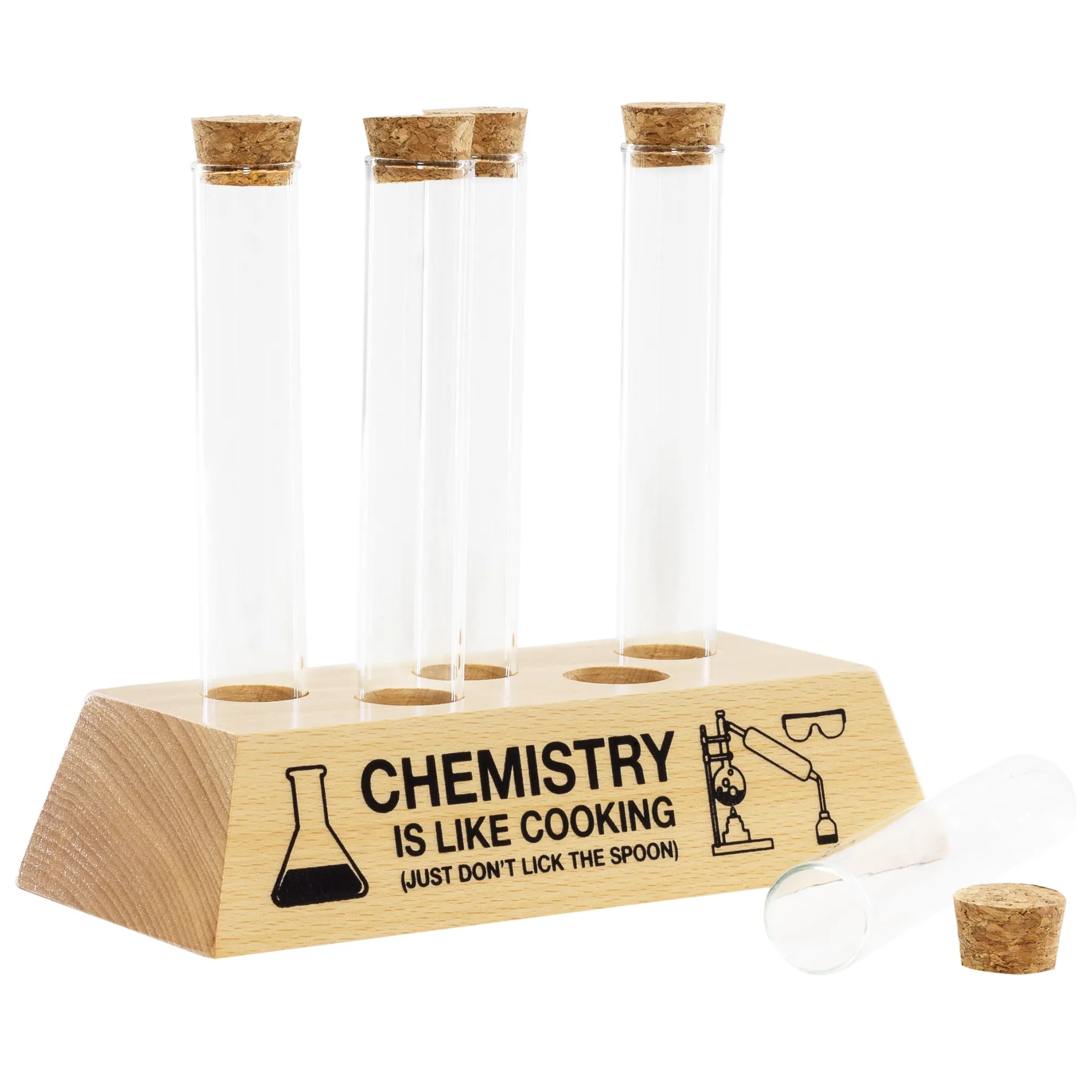 Und das Reagenzglas-Gewürzregal wird Dir dabei helfen, auch in diesem Feld zur absoluten Elite zu gehören! Auf dem Sockel aus massivem Buchenholz finden fünf Glasröhrchen Platz, die sich mit Gewürzen füllen und mit einem Korken verschließen lassen. Dank der Lackierung verkraftet das Holz auch den gelegentlichen Spritzer Tomatensauce ohne Probleme! Und falls Du im Eifer des Gefechts doch mal durcheinander kommst und nicht weißt, ob Du gerade im Labor oder in der Küche bist, hilft Dir der Aufdruck weiter: Chemie ist wie Kochen, nur solltest Du bei ersterem den Löffel nicht ablecken. Und überhaupt: Natriumchlorid, Natriumphosphat – wo ist da denn bitte der Unterschied? 😉
