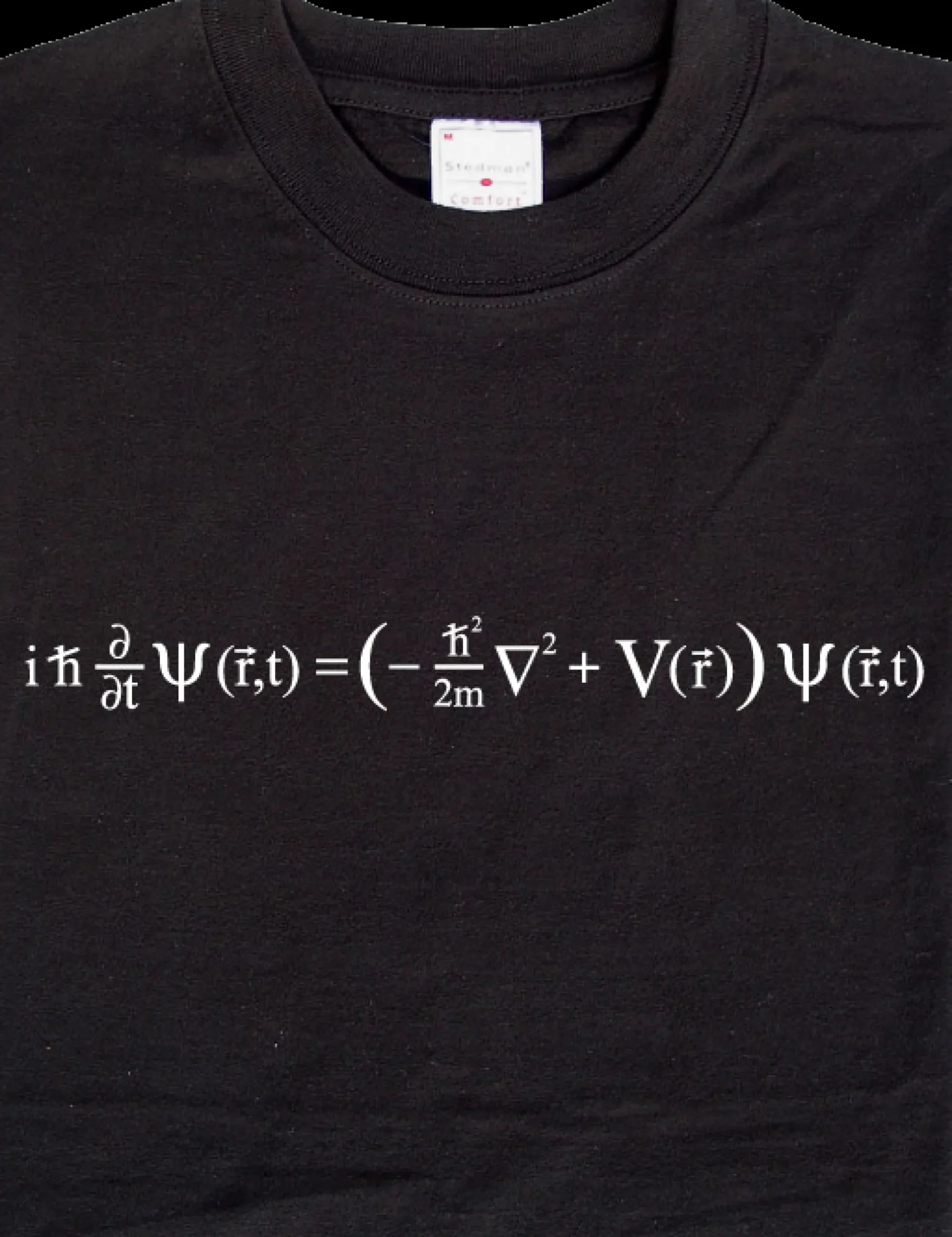 Die zeitabhängige Schrödingergleichung beschreibt den Zustand eines Quantensystems. Und natürlich passt diese Gleichung auch perfekt auf ein T-Shirt 🙂
