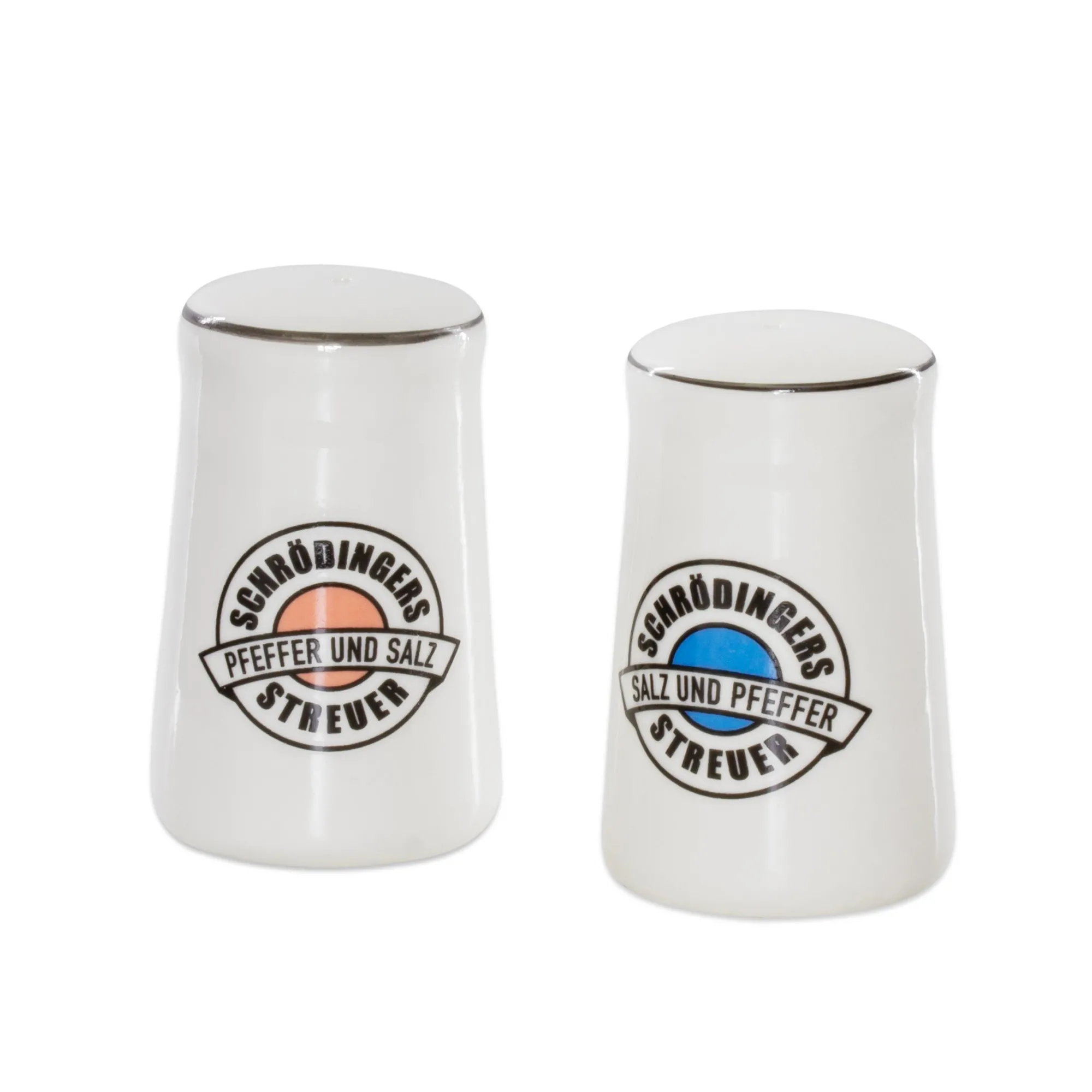 Bei Schrödingers Salz- und Pfefferstreuern geht es im Grunde um die gleiche Sache – nur wird die Katze aus Gründen des Tierwohls durch Gewürze ersetzt. Auf den ersten Blick erscheinen die beiden Streuer (fast) identisch, sodass nur durch das Streuen entschieden werden kann, ob sich nun Salz oder Pfeffer im Inneren befindet. Ein kurzer Text auf der Rückseite erläutert außerdem die physikalischen Prinzipien, die bei dem ach so trivial anmutenden Kippen der Streuer am Werk sind.