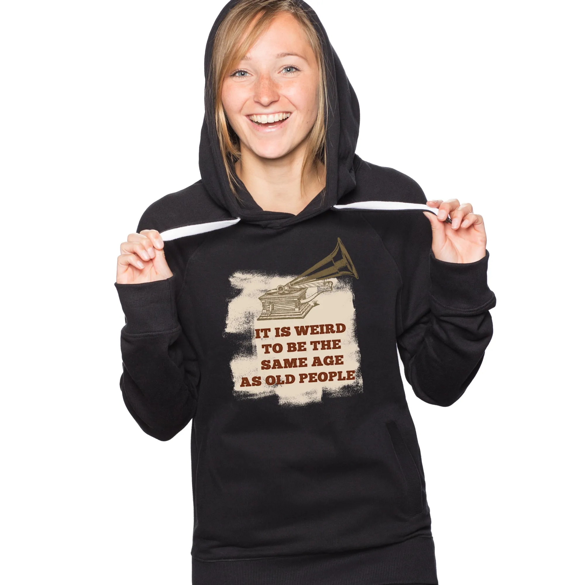 Eben noch hat man sich über die eigenen Eltern oder Großeltern geärgert, und im nächsten Moment stimmt die Zahl auf der Geburtstagstorte überhaupt nicht mehr mit der eigenen Selbstwahrnehmung überein. Das T-Shirt „Wie alte Leute“ greift auf humorvolle Weise die allgemeine Überraschung und das leichte Unbehagen auf, das manche Menschen empfinden, wenn sie feststellen, dass sie das Alter erreicht haben, das sie früher für „alt“ hielten. Auf dem T-Shirt ist das nostalgische Bild eines Grammophons zu sehen, das symbolisch für vergangene Zeiten und ältere Generationen steht. Der Spruch darunter lautet: „It is weird to be the same age as old people“. (Es ist seltsam, das gleiche Alter wie alte Menschen zu haben).